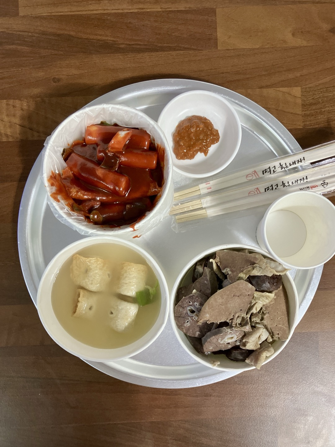 떡볶이 1인분(3,500원), 순대 1인분(4,500원), 오뎅 1개(1,000원)를 주문하면 은색 쟁반에 담아주시는데, 빠알간 떡볶이의 비주얼이 나를 설레게 만들었다. 떡볶이를 한 입 베어 물었는데, 내가 어릴 적 학교 앞에서 사 먹었던 바로 그 맛이었다. 새빨갛지만 그렇게까지 맵진 않고 적당히 맵고 단 꾸덕꾸덕한 그런 떡볶이. 여기 떡볶이가 누구에게나 맛있는 맛이었는지 나의 추억 때문이었는지 모르겠으나, 배가 고프지 않았음에도 불구하고 손을 멈추기가 힘들었다. 순대는 우리가 아는 그 순대 맛인데 내장을 먹어보니 신선한 것 같았고, 같이 갔던 서울 친구들은 순대 옆 막장에 놀랐지만 나에게는 익숙한 페어링이었다. 떡볶이를 다 먹고 그냥 돌아설 수 없어서 결국 다시 줄을 서서 1인분을 포장했다. 포장한 떡볶이를 집에서 데워먹으며 다시 한번 어릴 적 추억에 잠겼다.