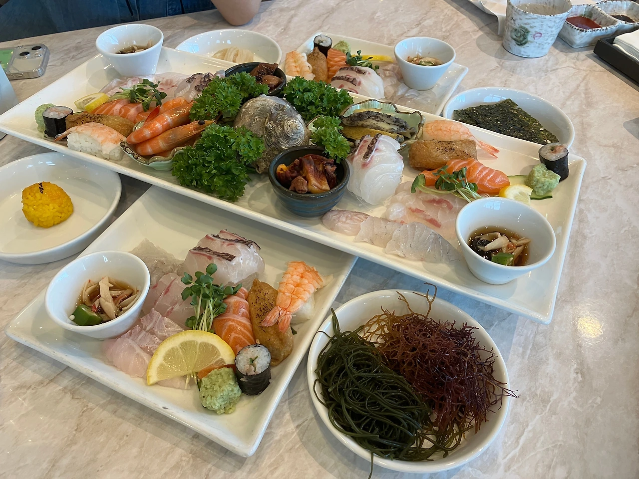 그리고 식사도 꽤 마음에 들었는데, 난 리조트 2층에 있는 블루시걸 레스토랑에서 뷔페식으로 먹었다. 저녁과 다음 날 아침 두 끼를 먹는 동안 마치 호텔 결혼식에 온 것처럼 다양한 음식들을 실컷 먹을 수 있었다. 아무래도 아침보다는 저녁에 음식의 종류가 더 많았는데, 단체 방문이라 따로 준비해 준 것인지는 잘 모르겠지만 회도 따로 테이블별로 준비되어 있어 따로 횟집에 가지 않아도 되었다. 레스토랑에서도 바다를 보면서 식사를 할 수 있어서 여행 기분을 제대로 즐길 수 있었다.