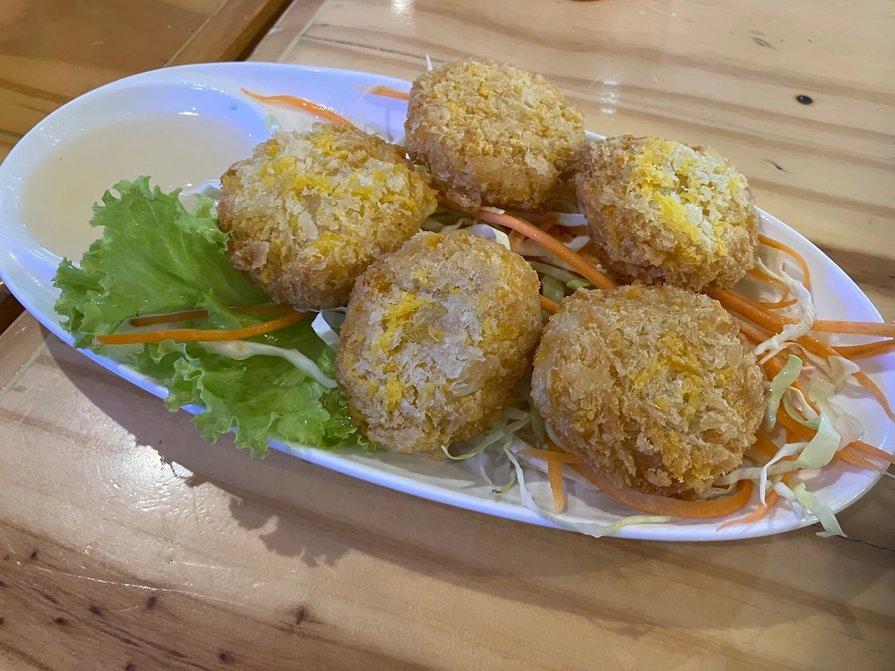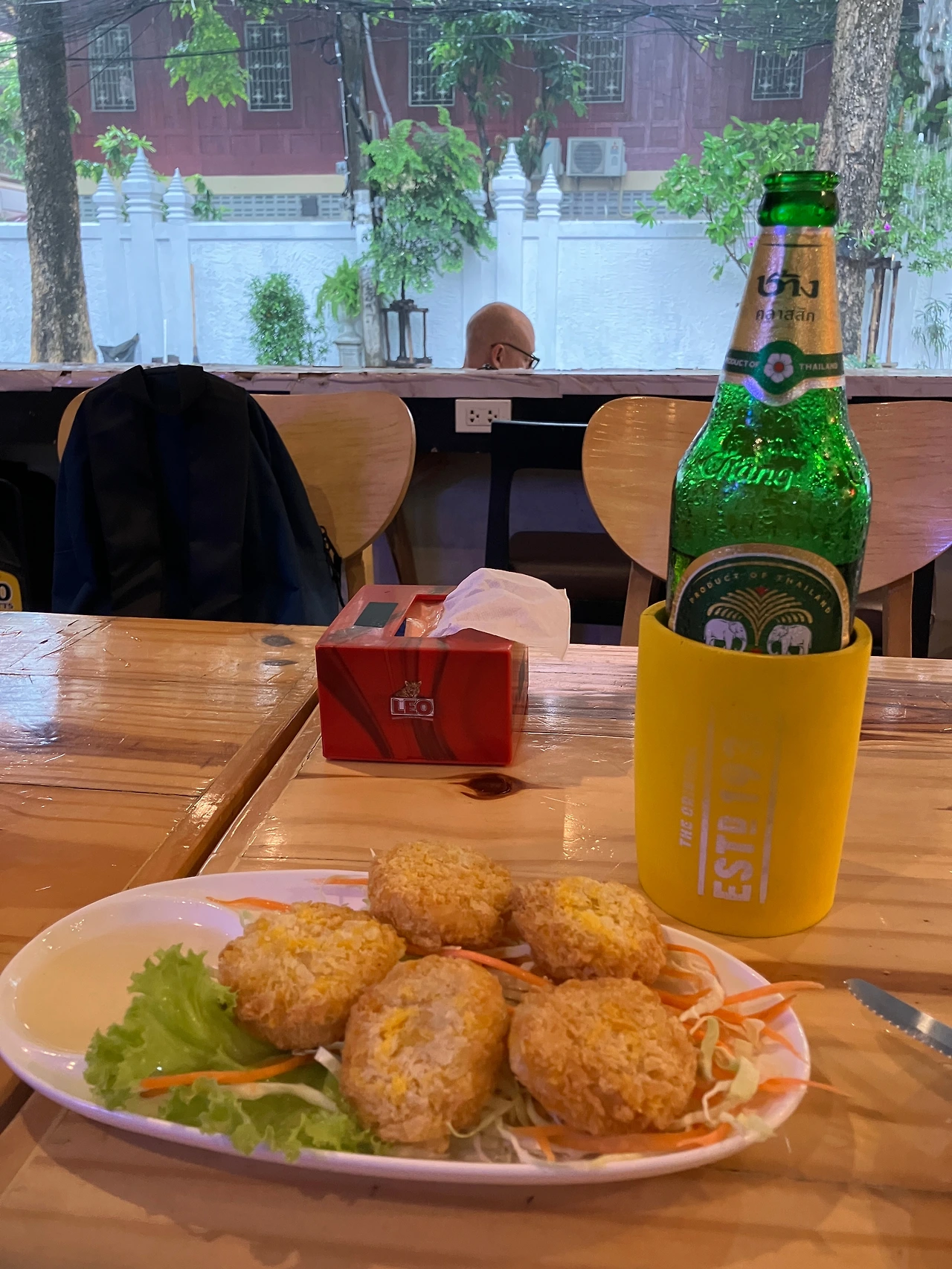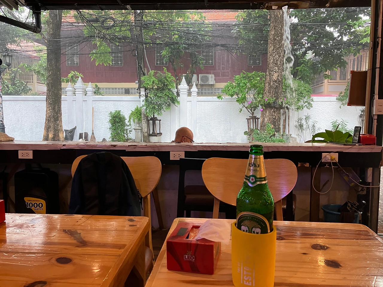들어선 곳은 람부뜨리 거리에 있는 <퍼피앙(Popiang)>이라는 곳이었다. 예전부터 길을 오가며 보던 곳이었지만 들어가 본 것은 이번이 처음이었다. 배도 고프고 꽤나 피곤하기도 해서 쉬어가면 좋을 타이밍이기도 했다. 우리는 맥주(100바트) 두 병과 새우크로켓(150바트)을 주문했다. 억수같이 쏟아지는 비가 도시를 물들이는 풍경을 보며 맥주 한 모금, 크로켓 한 입을 했다. 지나가는 자동차는 바퀴가 반쯤 물에 잠긴 채로 엉금엉금 기어갔다. 문득 비내리는 소리를 이렇게 가만히 들어본 게 꽤 오랜만이라는 생각이 들었다. 비가 정말 갑자기 많이 내리는 바람에 무작정 들어온 곳이었지만, 이렇게 비오는 카오산의 풍경을 보며 멍때릴 수 있는 시간이 문득 좋았다.