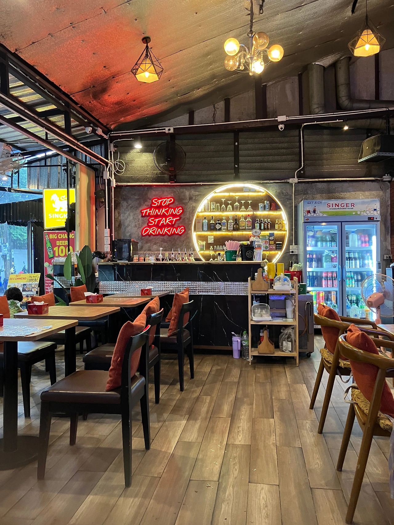 카오산에서는 카드보다는 현금을 사용할 일이 더 많았다. 아무래도 내가 길거리 음식을 많이 사먹으니 그랬던 것이긴 하다. 카오산에 도착했으니 식사를 하기 위해서뿐만 아니라 비상금으로 사용하기 위해서라도 환전을 해야만 했다. 잠도 자고 싶지만 일단 배부터 좀 채워야만 했다. 짐을 대충 풀고 환전을 하러 밖으로 나갔다. 그런데 환전소를 찾아가서 환전할 때쯤부터 비가 조금씩 내리기 시작했다. 보통 이맘 때면 우기가 끝났기 마련인데, 기후변화 때문인지 올해는 아직 우기가 덜 끝난 모양이다. 급격하게 흐려지는 날씨에 후다닥 환전을 하고 대충 먹을 걸 사들고 숙소로 얼른 돌아가야겠다고 마음먹고는 발걸음을 재촉하려는 그 순간, 갑자기 비가 정말이지 미친듯이 쏟아지기 시작했다. 거센 빗줄기에 도로에는 금세 물이 차올랐고, 작은 개울이 되어버렸다. 이대로는 숙소로 돌아갈 수 없을 것 같았다. 가게 앞 차양 같은 곳에 멈춰서서 잠시 기다려봤지만, 아무래도 지나가는 소나기는 아닌 듯하다. 이렇게 길 한가운데에서 발이 묶여버리나 싶었다. 길에 차오른 물은 점점 더 깊어져서 이제는 거의 발목까지 잠기기 시작했다. 이럴 거면 맘 편히 뭐라도 먹자 하는 마음으로 근처에 있는 바 겸 식당으로 그냥 뛰어 들어갔다.