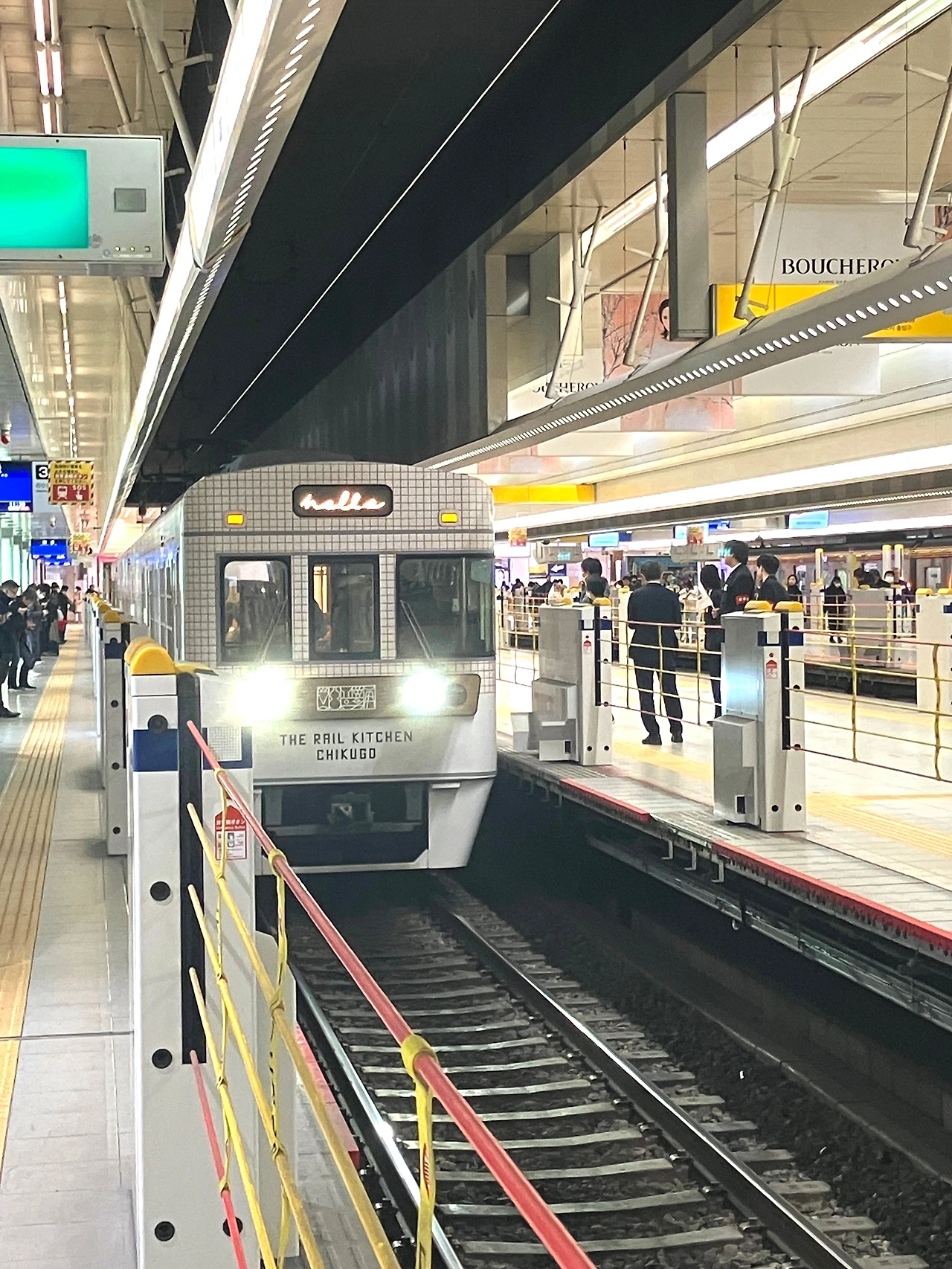 니시테츠 텐진역에서 <다자이후 텐만구>에 가기 위해 다자이후역으로 가는 길, 플랫폼에서 일반 열차와는 다른 열차를 보게 되었다. 우리가 탈 열차인가 싶어 두리번거렸지만 행선지가 적혀있지 않다. 그리고 플랫폼에서 열차를 기다리던 사람들도 연신 사진을 찍어댄다. 곧이어 그 열차가 움직이고 우리 앞을 지나가버렸다. 지나가는 열차 외관에는 'THE RAIL KITCHEN CHIKUGO'라고 쓰여 있었고, 열차 안에는 사람들이 테이블에 앉아 있는 것이 아닌가?