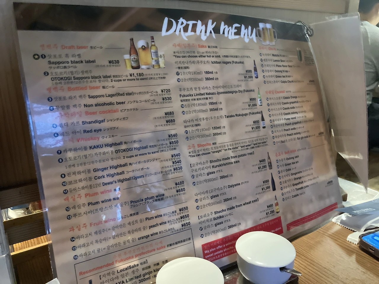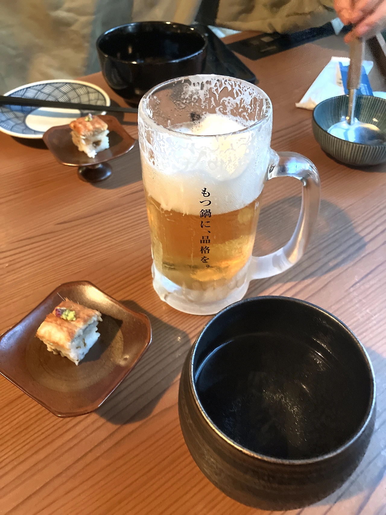 가게 직원이 예약을 확인하고, 우리의 국적을 확인한 후에는 한국어 메뉴판을 건네주며 예약석으로 안내해 주었다. 가게 내부는 미리 사진에서 본 것처럼 매우 아늑했다. 자리는 나란히 앉을 수 있는 카운터석과 테이블석의 두 종류가 있었다. 일본의 유명인이나 연예인들이 많이 방문했는지 이런저런 사인들도 많이 붙어 있었다. 우리는 창가 쪽 작은 테이블석에 앉아 미소(된장) 모츠나베(1,780엔)와 술을 주문했다. 술은 생맥주(삿포로 검은 라벨 630엔)와 규슈의 지역 술인 고구마소주(다이야메 580엔)로 주문. 테이블에는 금세 '오토시'라고 부르는 기본 안주가 놓이고 술도 이어서 나왔다.(오토시는 380엔으로, 저녁시간에만 있다.) 시원한 생맥주와 따뜻하게 주문한(오유와리) 고구마소주를 마시고 있노라니, 주문했던 오늘의 메인요리 등장!