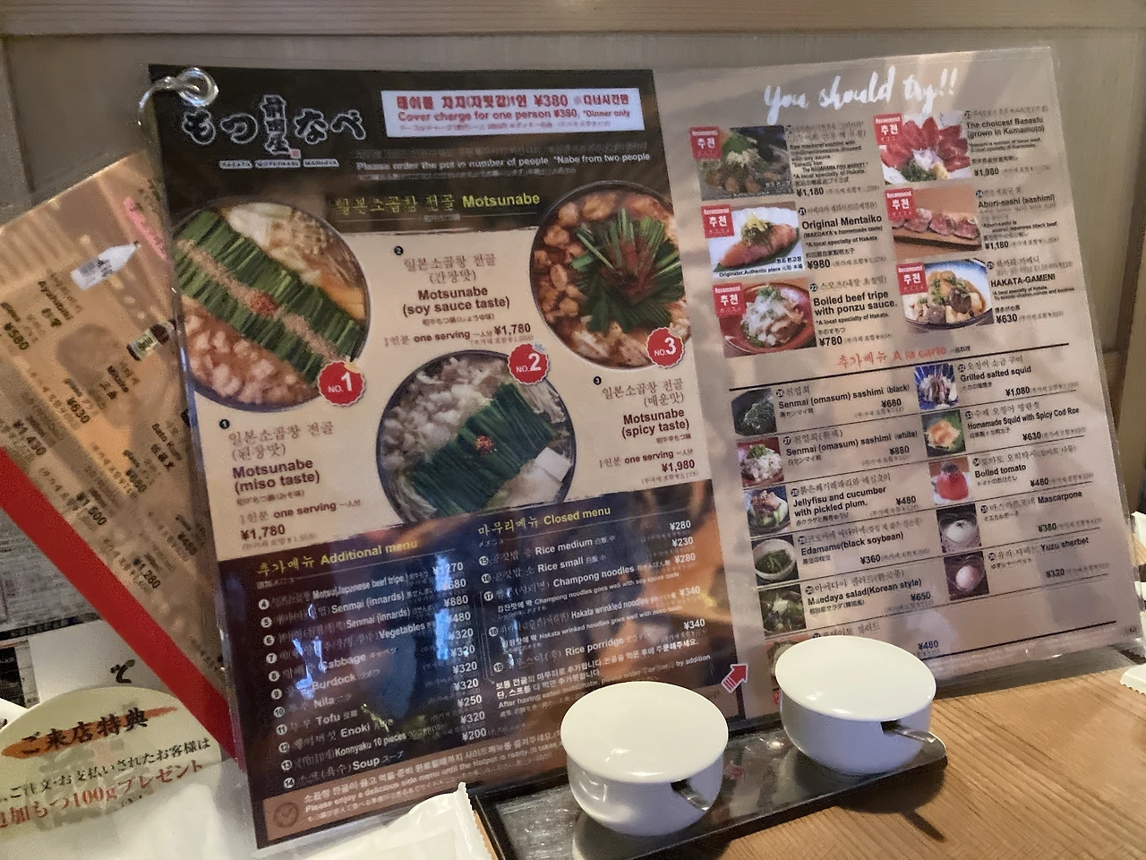 그동안 후쿠오카를 몇 번 여행하는 동안 아직까지도 도전해보지 못한 몇 가지 음식이 있었다. 그중에서 가장 궁금했던 음식은 '모츠나베'. 우리나라 곱창전골쯤 되는 이 음식이 궁금했지만, 어쩌다 보니 이런저런 이유에서 먹어볼 기회가 없었다. 그래서 이번 후쿠오카 방문에서는 꼭 먹어보리라 생각을 하고 모츠나베 식당을 찾아보다가 드디어 마음에 드는 식당을 발견했다. 후쿠오카에는 라멘집만큼은 아니어도 꽤 많은 모츠나베 식당들이 있었는데, 그중에서도 우리가 선택한 식당은 <하카타 모츠나베 마에다야(博多もつ鍋 前田屋)>였다.