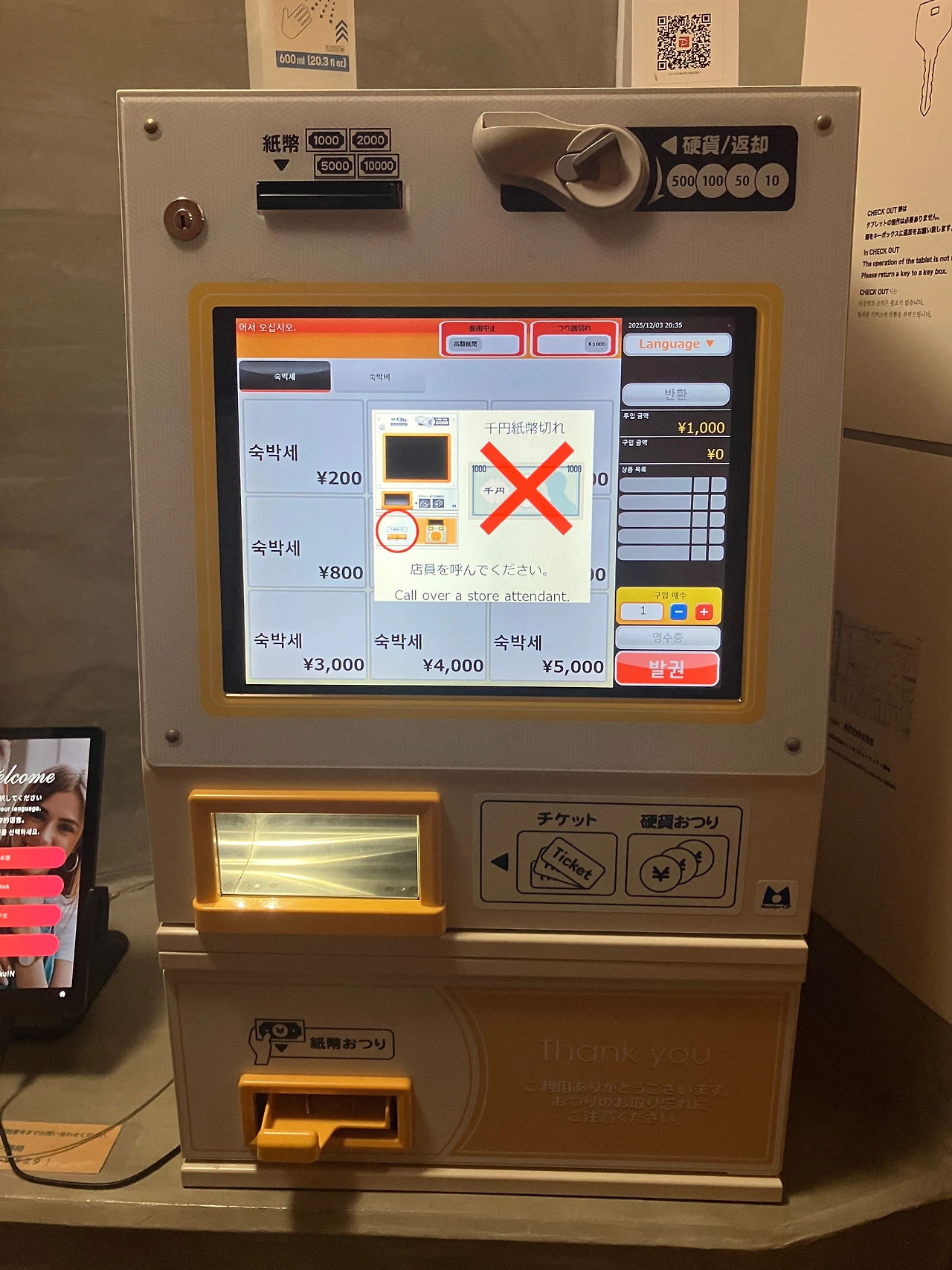 이곳은 아파트형 숙소라서 따로 프론트나 직원이 없고, 사전에 운영 측으로부터 안내 받은 대로 셀프 체크인을 해야 했다. 후쿠오카에는 이런 숙소들이 많아서 이런 방식이 이미 익숙한 터라 이것 또한 어렵지 않게 진행할 수 있었다. 그런데 순조롭게 진행되던 체크인에서 문제가 발생했다. 사전 안내를 받은 대로 방 번호와 열쇠까지는 받았다. 이 숙소는 1인 1박에 4만 원 대인데, 숙박요금에 후쿠오카 숙박세(1인 1박에 200엔)가 포함되지 않아서 따로 지불을 해야 했다. 그리고 숙박세 지불을 위해 아파트 입구에는 자판기 형태로 숙박세를 낼 수 있게 기계가 구비되어 있었다. 그런데 천 엔짜리 지폐를 넣고 잔돈을 거슬러 받아야 하는 그때, 이 썩을 놈의 자판기가 숙박세도 처리 안 하고는 내 돈을 먹어버린 것이었다.