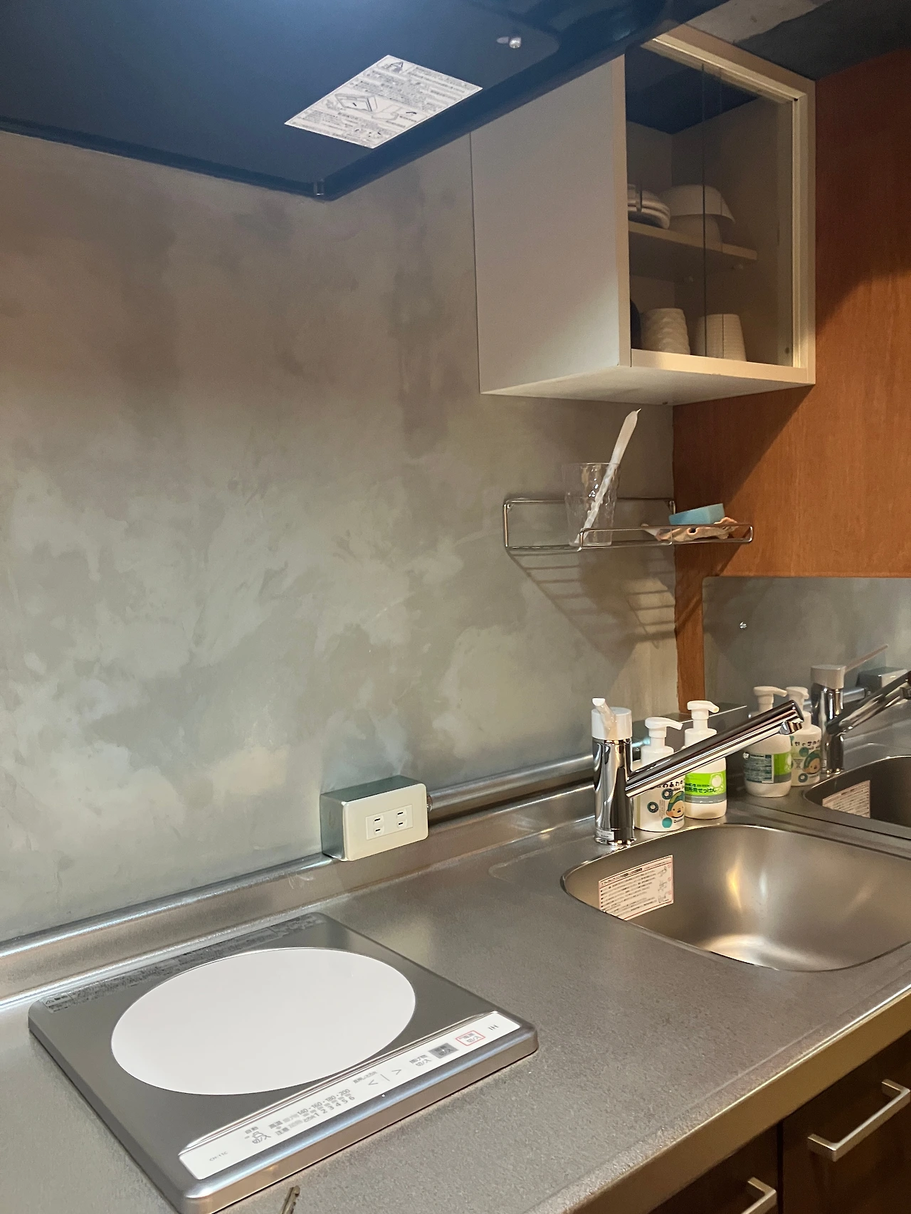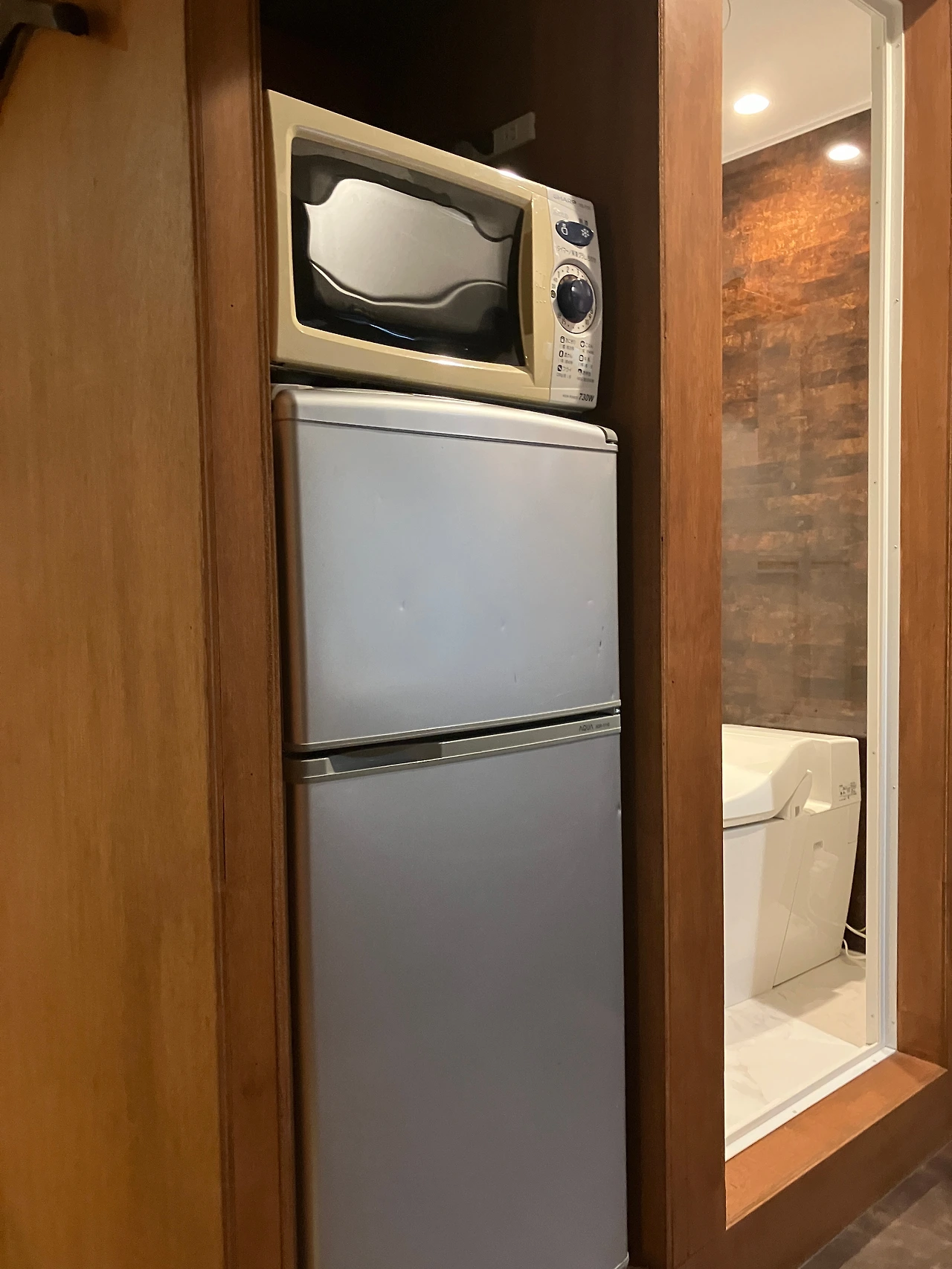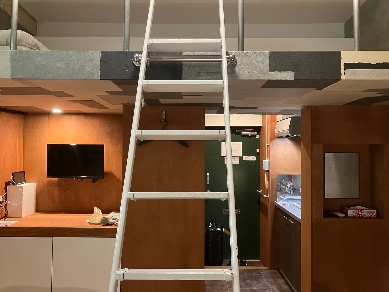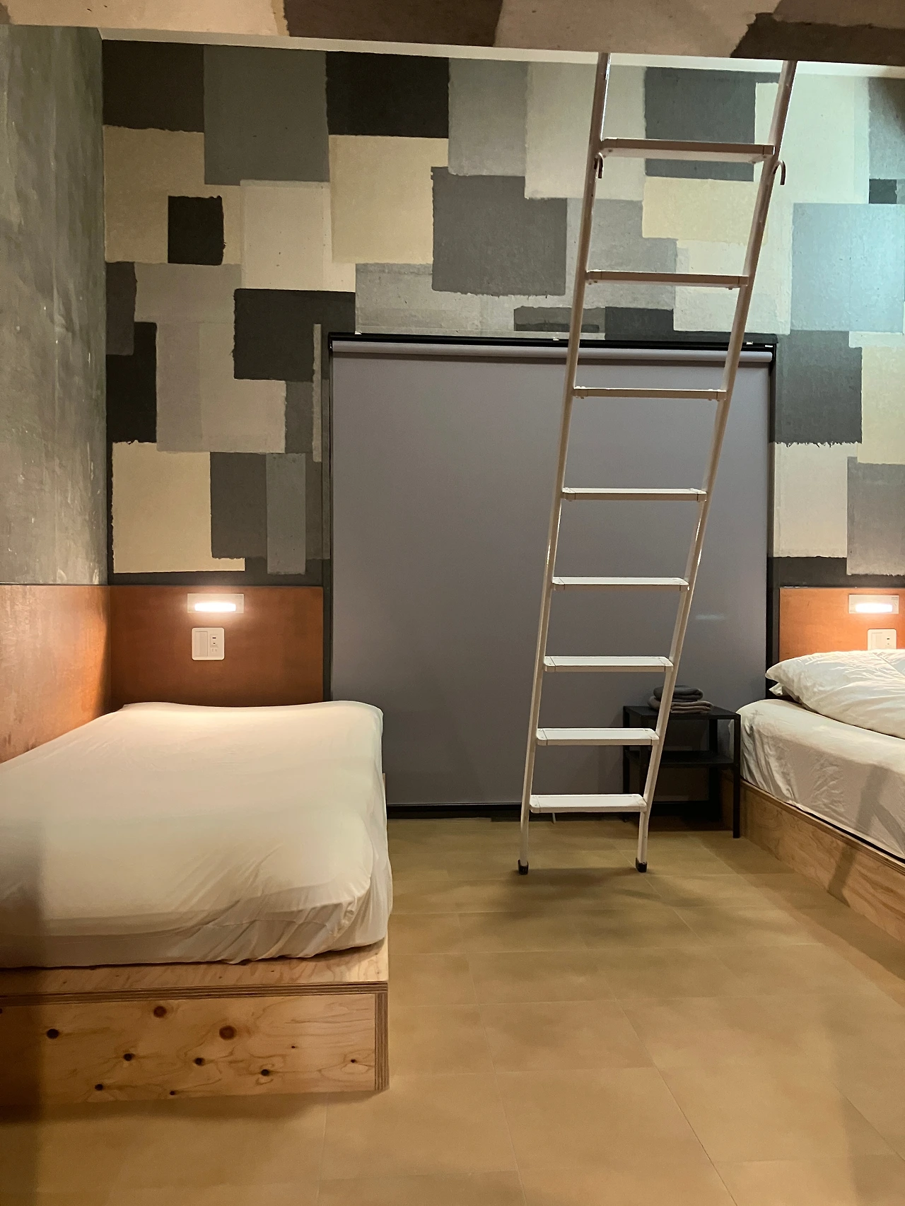 다시 돌아온 숙소를 그제야 찬찬히 둘러볼 수 있었다. 이제 보니 복층 구조이다. 1층에는 싱글 침대 두 개가 있고, 복층에도 잘 수 있도록 침구류가 구비되어 있었다. 방 사이즈는 작았지만 머물고 자는 데에는 불편함이 없었고, 욕실에는 어매니티도 구비되어 있었다. 객실 입구에는 작은 싱크대와 인덕션이 있고, 냉장고와 전자레인지까지 있어 편의점 도시락을 데워 먹기에도 편했다. 다만 욕실에는 세면대가 없어서 주방 싱크대에서 양치를 하거나 손을 씻어야 해서 그 부분은 조금 불편할 수도 있겠다 싶었다.