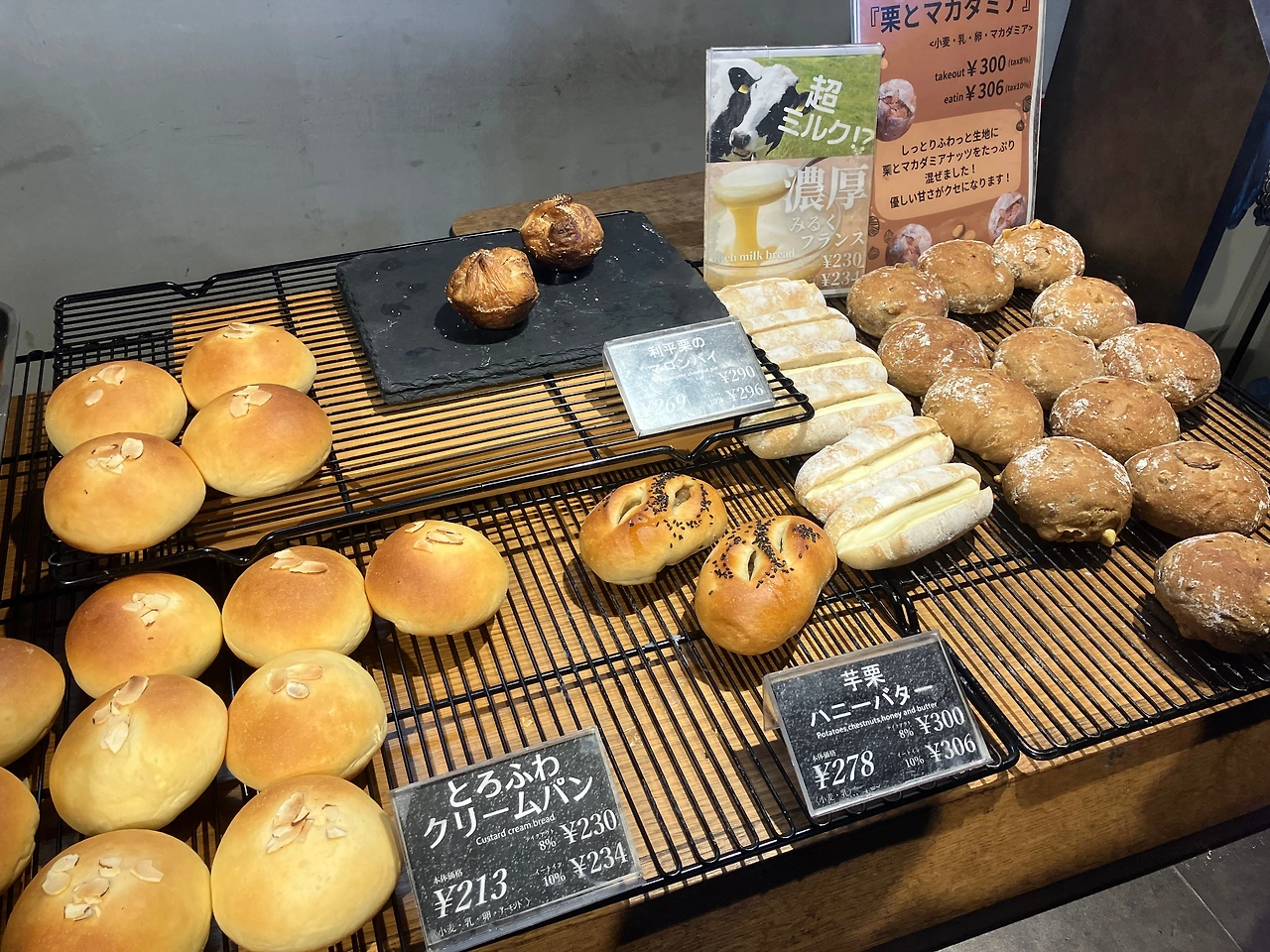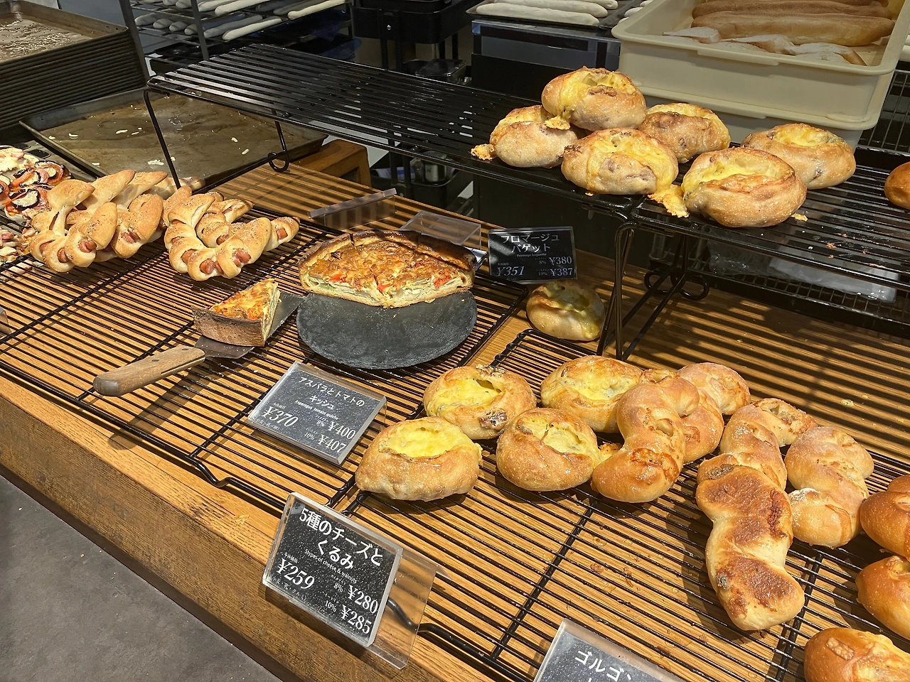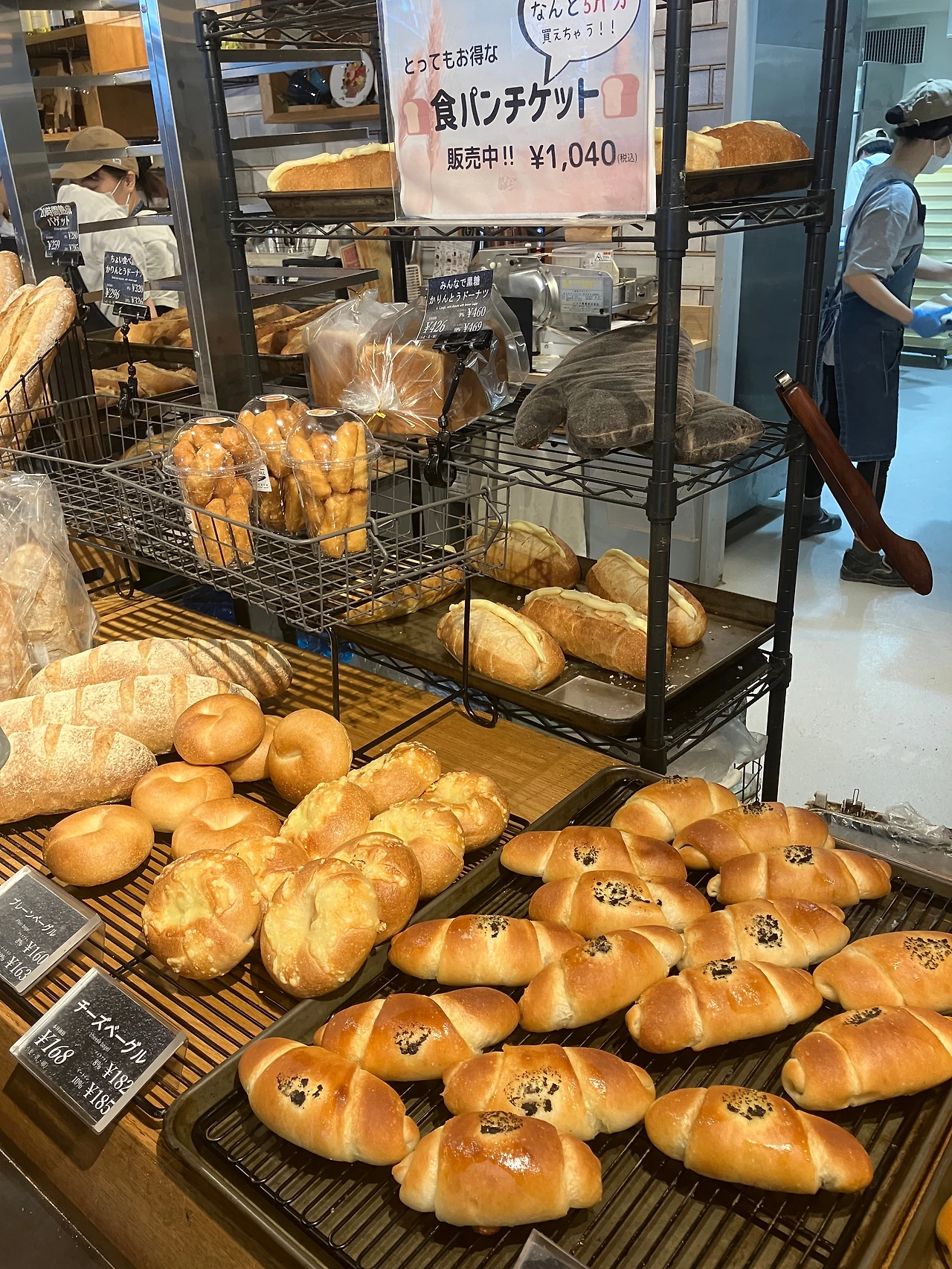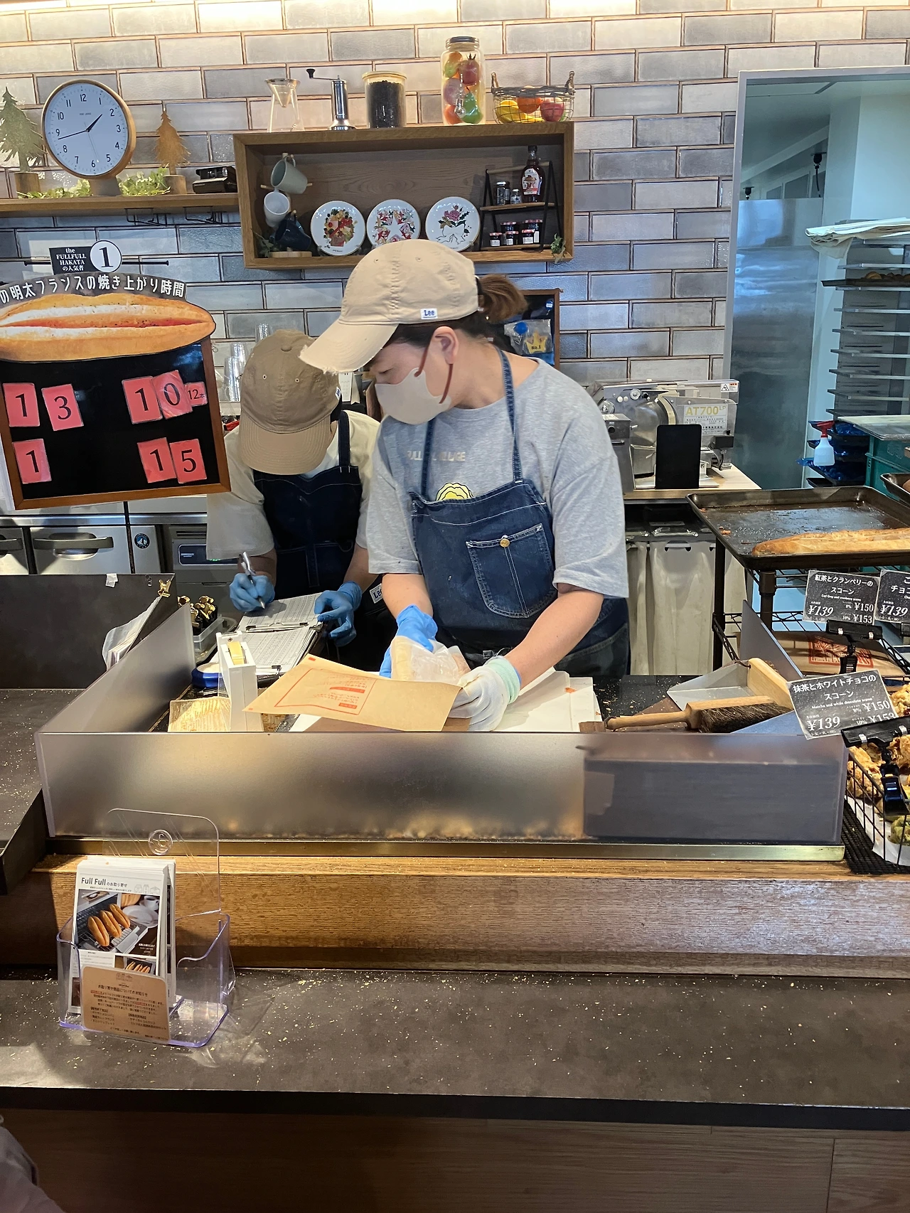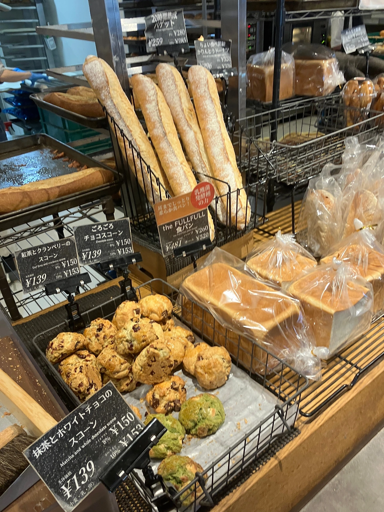 매장 안에 들어서서 다양한 빵들을 구경하며 '명란 바게트'에 대한 구매 의욕이 불타기 시작했다. 매장 안에서 10분 정도 더 줄을 선 후에야 드디어 계산대 근처에 도착! 계산대 앞에 있던 스콘의 유혹을 뿌리치지 못하고 두 개를 담았다. 크기는 작았지만 150엔(테이크아웃 세금 8% 추가된 금액, 매장 취식 시 세금 10% 추가로 153엔)이라는 착한 가격의 스콘을 도저히 외면할 수 없었던 것이다. 얼그레이 스콘과 말차 스콘을 쟁반에 담고 '명란 바게트'(테이크아웃 가격 480엔)를 주문했다. 직원이 잘라줄지 통으로 줄지 물어보는데, 자르는 것이 나중에 먹기에도 편하니 대부분 잘라 달라고 한다. (계산대 옆에선 바게트만 잘라주는 직원이 따로 있을 정도)