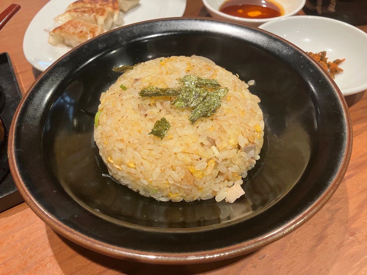주문하는 방식은 가게 입구 키오스크에서 주문하고(카드결제 가능) 출력되는 주문서를 받은 다음, 자리에 앉아 주문서를 직원에게 주면 되는 일반적인 방식이었다. 우리는 돈코츠 라멘(780엔)과 매운 차슈멘(950엔)을 주문했다. 달걀을 추가하고, 런치시간(오픈~오후 3시까지)에 주문할 수 있는 작은 볶음밥(280엔)과 교자(180엔)도 추가했다. 오래지 않아 주문한 음식들이 줄줄이 나왔다. 국물을 한 입 하니, 술을 많이 마시지도 않았는데도 속이 풀리는 기분이었다.