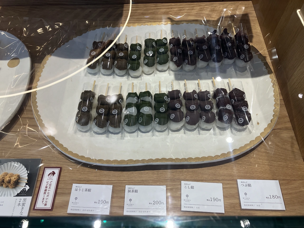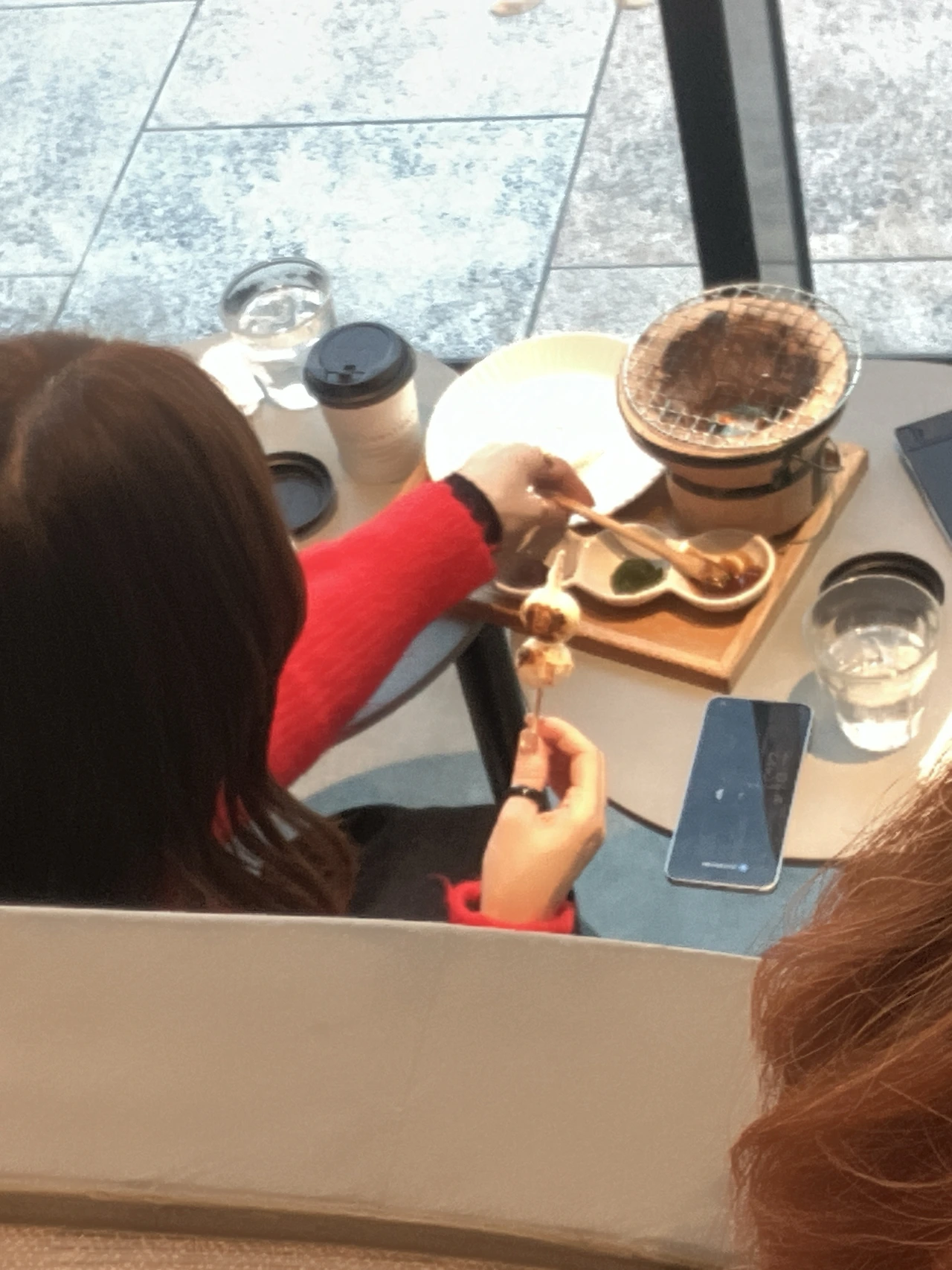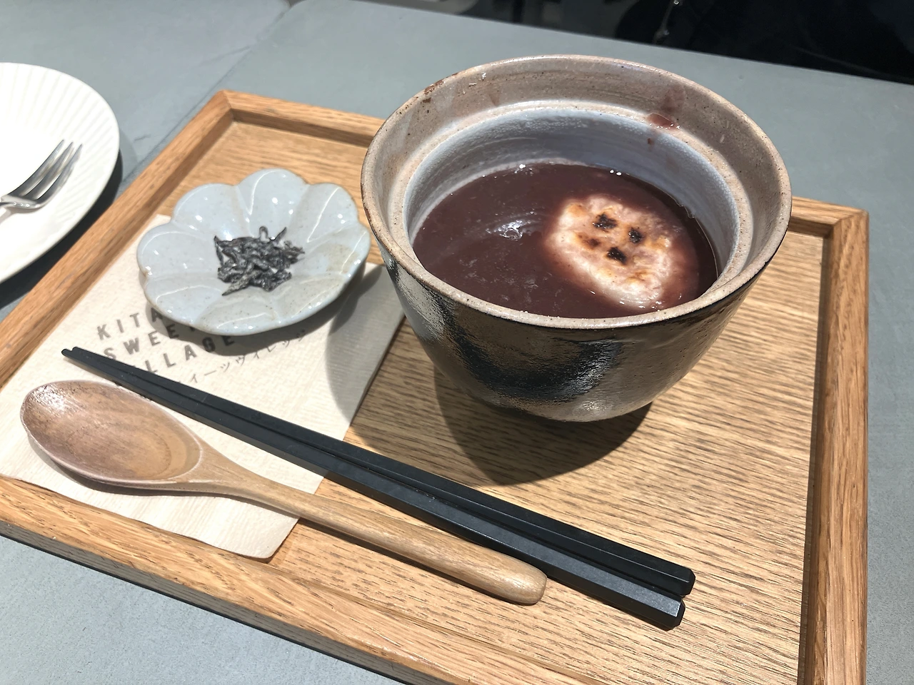 주문을 하고 가게 안을 둘러보니, 끊임없이 손님이 오고 갔다. 다른 테이블에 앉은 사람들이 뭘 먹나 보니, 개인 화로에 당고를 직접 구워 먹기도 하고, 가볍게 식사를 즐기기도 한다. 유명한 가게인 건가 싶어서 그때서야 검색을 해보기 시작했다. 여기는 1950년 기타큐슈시에서 시작된 가게로, 일본 화과자의 일종인 카린토로 유명하며, 이외에도 모찌, 와라비떡, 양갱 등이 주력 제품이란다. 지나가다 우연히 들어오게 된 곳이 알고 보니 오래되고 유명한 가게였던 것이다. 주문한 메뉴들이 나오고, 커피와 함께 디저트 3종을 즐겼다. 말차 케이크는 진한 말차맛이 인상적이었고, 고구마 케이크는 고구마향이 나긴 했지만 단맛이 아주 강했다. 마지막으로 젠자이는 묽은 단팥죽에 떡이 들어있는 것이었는데, 곁들여 나오는 시오콘부랑 같이 먹으면 감칠맛이 더해졌다.