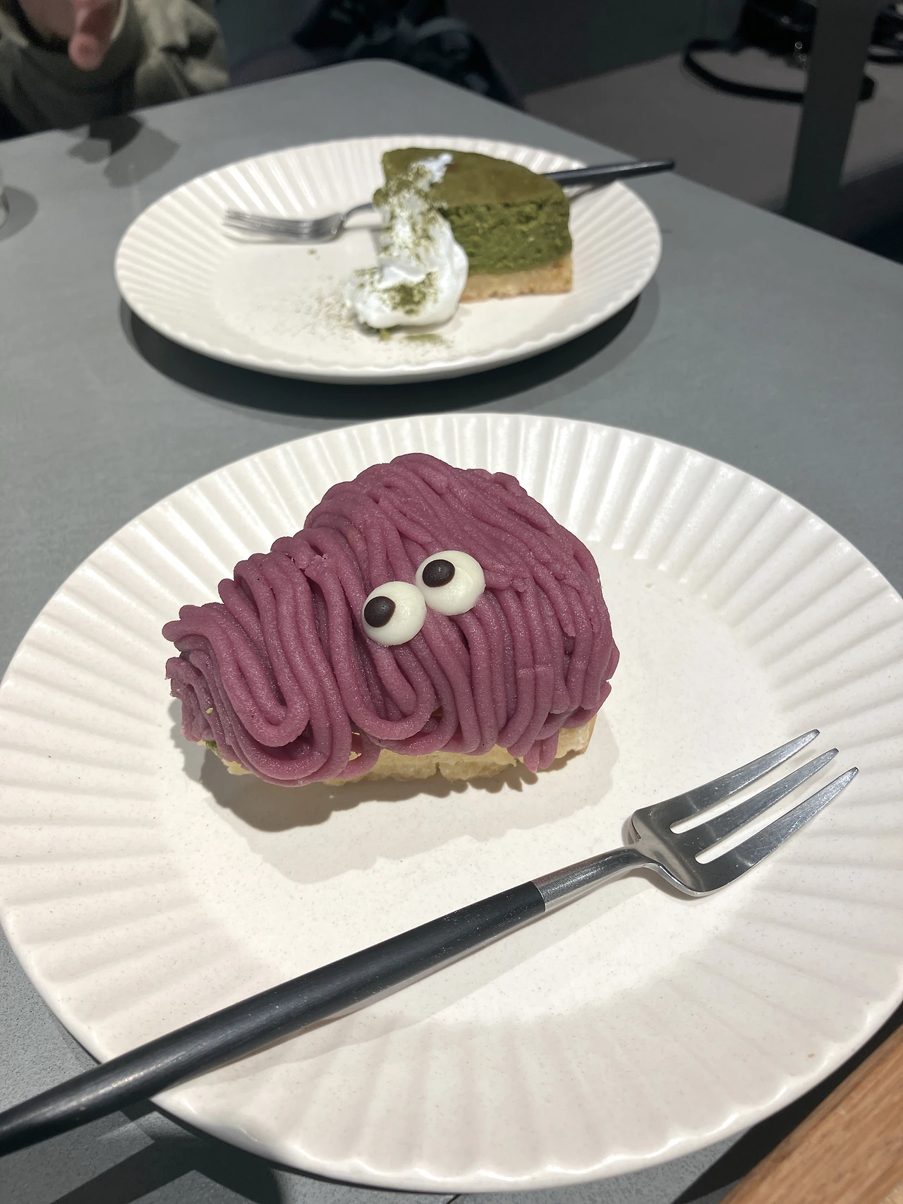 가게 내부는 디저트를 준비하는 곳과 테이크아웃으로 구매할 수 있는 제품이 진열된 곳, 가게에서 먹고 갈 수 있도록 손님들이 앉는 곳으로 구역이 나뉘어 있었다. 주문은 테이블에 붙어있던 QR코드로 손쉽게 할 수 있었다. (메뉴 정보 https://www.kikutaro.net/cafe.html) 우리는 따뜻한 아메리카노(480엔)와 말차 케이크, 고구마 케이크, 젠자이를 주문했다. 디저트 가격은 대략 650-800엔 정도였는데, 음료와 함께 주문을 하면 가격이 조금 저렴해졌다.