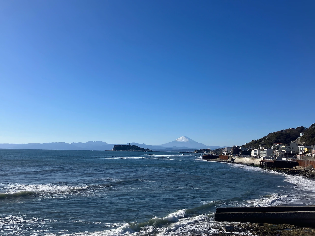 우리가 갔던 날은 다행히 하늘에 구름 한 점 없는 맑은 날이어서 가마쿠라코코마에역에서부터 바닷가를 따라 걷기로 했다. 가마쿠라코코마에 역에서 시치리가하마역 쪽으로 걸어가다가 중간에 만난 세븐일레븐에서 따뜻한 라테 한 잔을 샀다. 그리고 길 건너 해변에 있는 주차장으로 가서 후지산을 멀리 바라보며 망중한을 즐겼다. 바람은 조금 불었지만 맑은 날씨 덕분에 아주 선명한 후지산을 볼 수 있었다. 시치리가하마에서 조금 쉬었다가 또 다른 후지산 뷰포인트인 이나무라가사키 쪽으로 걸어서 다시 후지산을 보고 가마쿠라역으로 돌아왔다.