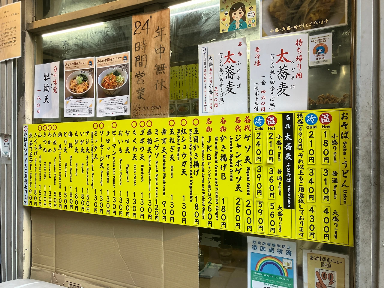가게 메뉴는 기본적으로 우동과 소바, 그리고 굵은 면 소바 이렇게 세 종류이다. 면 종류를 고른 다음엔 따뜻한 것/ 차가운 것을 고르고, 사이즈를 고르고, 그리고 나머지는 취향대로 튀김 토핑을 골라서 주문하면 된다. 토핑의 종류가 정말 많았다. 그중에서 가장 유명한 토핑은 대왕 오징어 다리 튀김(점보 게소텐)이고, 생강절임 튀김((베니쇼가텐)도 상당히 인기가 많았다.