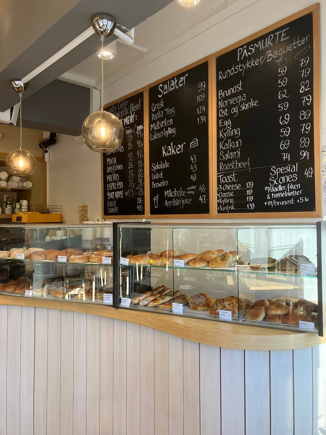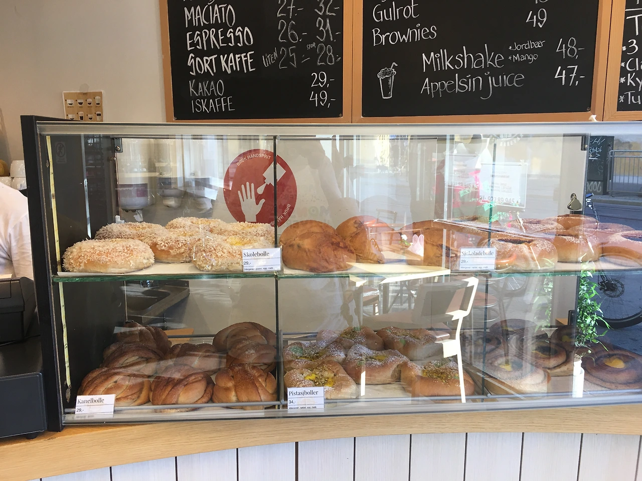 시차 적응이 전혀 되지 않은 상태라서 평소보다 이른 시각에 눈이 떠졌다. 전날 밤 10시가 다 되어서야 해가 저물었는데, 상당히 이른 아침에 눈을 떴는데도 벌써 하늘이 환하다. 가게 오픈 시간(오전 9시)에 맞춰서 바로 빵을 사러 갔다. 가게에 들어서자 갓 구운 빵 냄새가 가득했다. 한국의 프랜차이즈 빵집처럼 빵을 다른 곳에서 받아다가 판매하는 것이 아니라 가게에서 직접 모든 빵을 굽고 있었던 것이다. 아직도 여러 빵을 준비하는 모양인지 종류가 아주 다양하진 않았지만, 갓 구워진 빵들이 진열되어 있어서 식욕을 엄청나게 자극했다. 가게 안에는 빵을 주문해서 커피와 함께 먹을 수 있는 공간이 있어서 가게에서 먹고 가도 되고, 테이크아웃을 해도 된다. 다만 노르웨이어로만 쓰여 있어서 뭐가 무슨 빵인지 정확히 알 수는 없었다. 대신 빵 모양을 눈으로 보고 맛있어 보이는 빵 세 개를 직접 가리켜 골랐다. 가격대는 빵은 50 크로네 안팎이고, 커피는 30 크로네 안팎이다. 이렇게 되면 한국에서 사 먹는 빵 가격과 큰 차이가 나진 않는다.