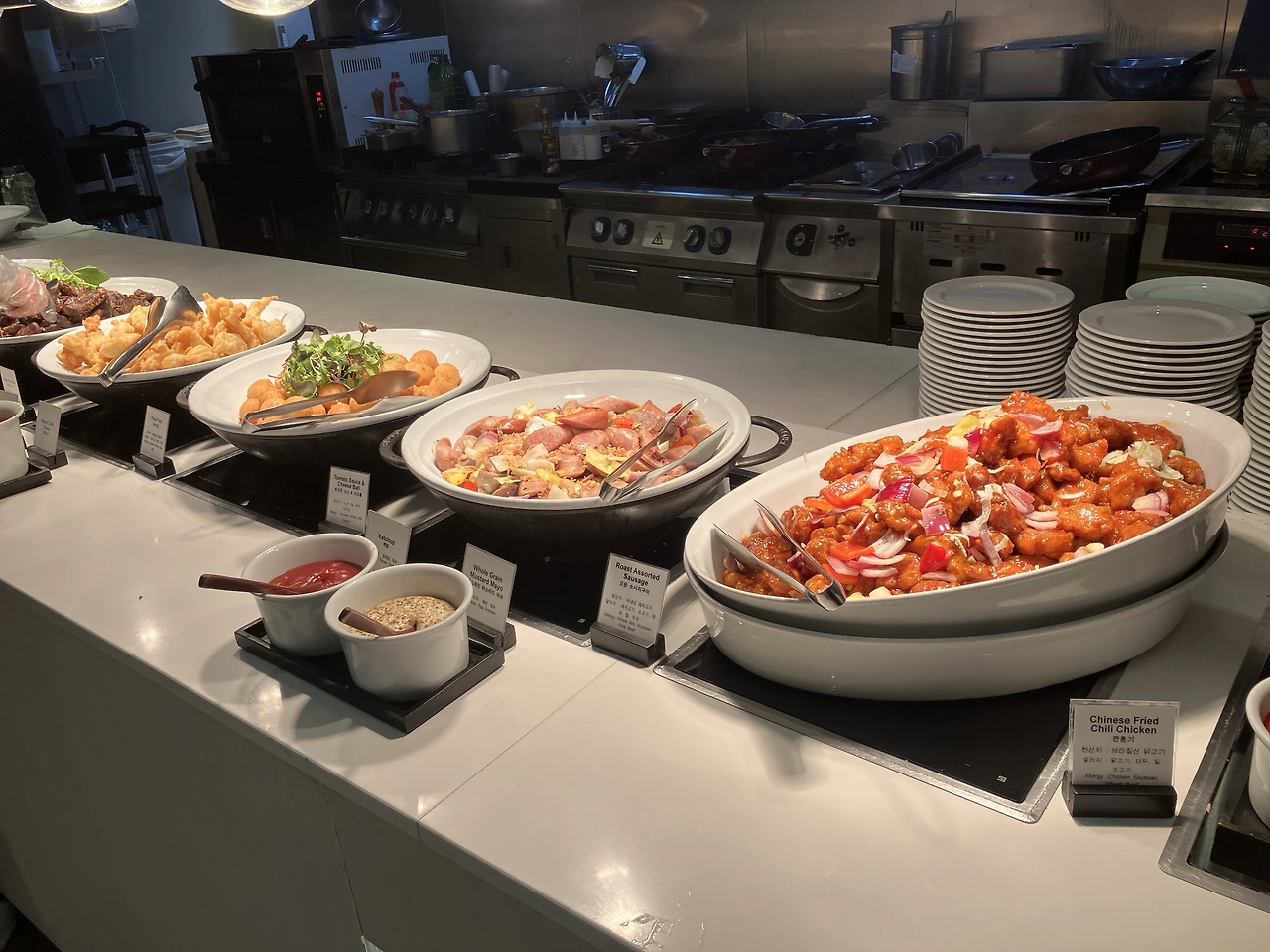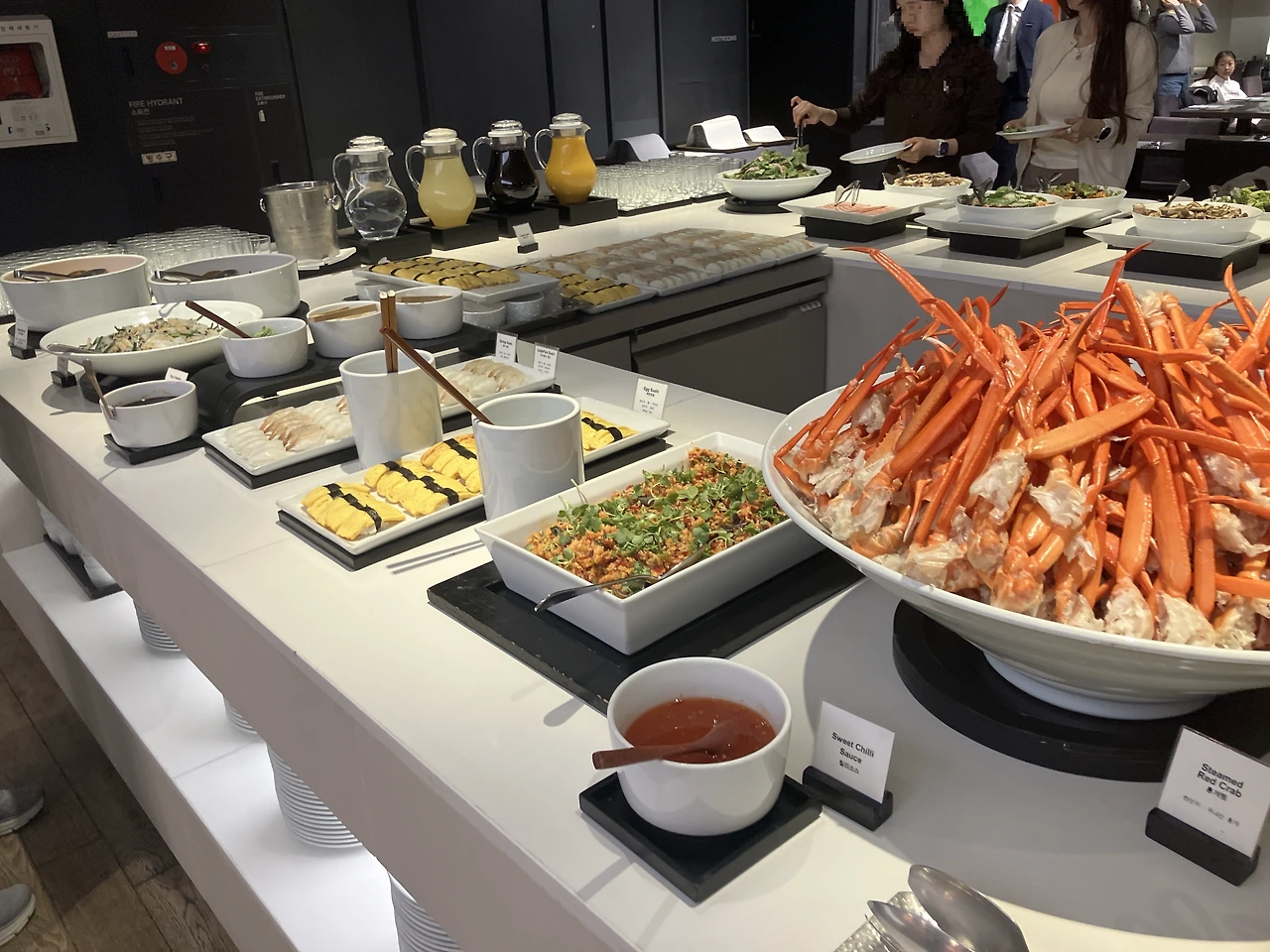 레스토랑은 넓은 편이었지만 그렇다고 붐비는 편은 아니었다. 음식의 종류는 대게, 짜장면, 피자, 깐풍기, 쌀국수, 육회비빔밥, 잡채, 초밥 등 한식, 양식, 일식까지 가짓수가 아주 많은 편은 아니었지만 괜찮은 음식들에 집중한 것 같았다. 음료는 주스 종류와 물이 준비되어 있었고, 맥주는 1만 원을 추가하면 무제한으로 즐길 수 있었다. (맥주를 마시면 음식을 거의 못 먹을 것 같아 우리는 추가하지 않기로 했다.) 그리고 맥주 이외에 다른 술들은 추가 주문을 하면 마실 수 있었다.