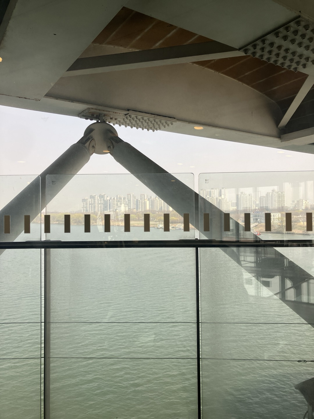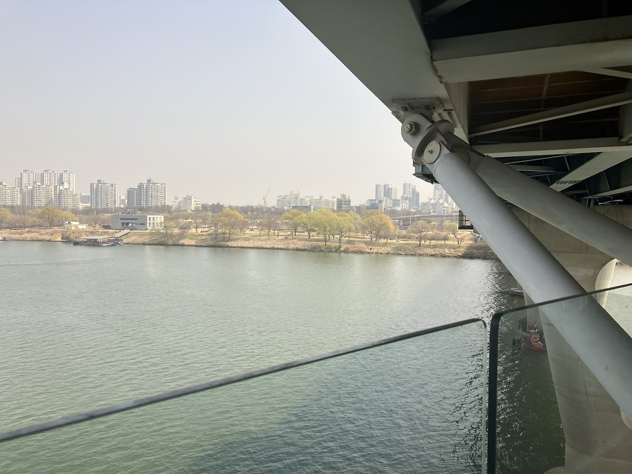 공연장과 전망대 가는 길이 나눠져 있었지만 공연이 열리지 않을 때에는 어느 쪽으로 내려가도 괜찮다. 우리는 전망대 쪽으로 갔는데, 내부에 카페처럼 작은 테이블과 좌석들이 마련되어 있었다. 음료 외에는 음식물 반입이 금지되어 있고, 음료를 구매할 수는 없었다. 전망대 내부에서 가장 눈에 띄는 것은 한강물을 직접 내려다볼 수 있는 유리 바닥이었다. 고소공포증이 있는 사람들은 유리 바닥을 밟는 것조차 힘들 것 같지만, 발아래로 한강물이 흘러가는 모습을 보는 것은 신선한 기분이었다.