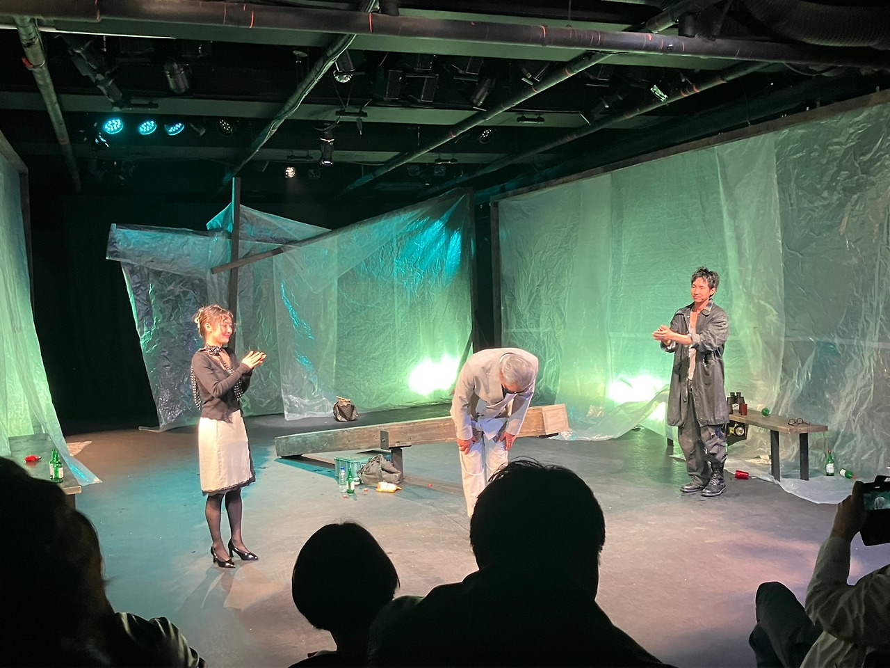이것은 희곡 텍스트가 거의 20년 전에 쓰인 것이기 때문에 생기는 문제이다. 희곡은 90년대 중후반에서 00년대 초에 이르는 한국사회를 배경으로 할 것이다. 그런데 공연에서는 시대적 배경을 보여주는 별다른 지표가 나타나지 않는다. 그렇다면 2026년 4월에 상연되는 연극 무대에서는, (과거 시대임을 가리키는 연극적 지표, 이를테면 날짜가 인쇄된 신문지를 등장인물이 읽게 한다든가 라디오/텔레비전 뉴스 내레이션이 흘러나온다든가 하는 연극적 지표를 사용하여) 극 중 시간적 배경이 과거의 어느 날이라는 점을 좀 더 선명하게 부각시키든가, 아니면 지금의 한국사회에 어울리도록 대본을 좀 더 각색하는 편이 좋지 않았을까 하는 아쉬운 마음이 든다.
