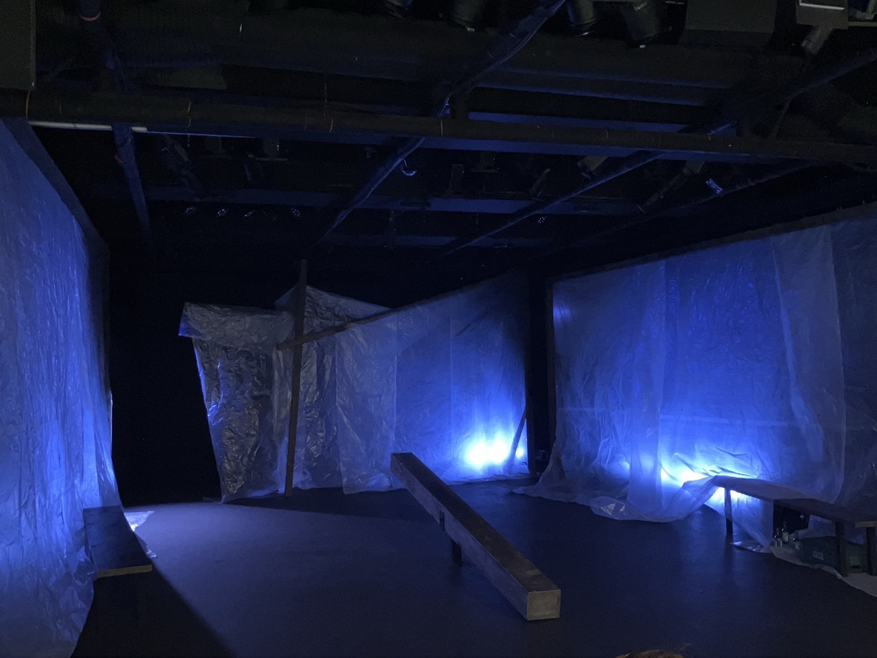 특히 빈 무대 한가운데에 오브제로 놓여있는 긴 나무막대기의 사선 구도가 불쾌한 불안을 지속시키게 된다. 공간을 비대칭적으로 분할하는 동시에 관객의 초점을 실효적으로 지배하는 통치성을 가진다는 점에서, 비스듬하게 놓여있는 긴 나무막대기는 <블루 초코 블루스>가 ‘불균형’과 ‘비대칭’, ‘경계’, ‘차별’, ‘폭력’, ‘불안’, ‘우울’에 관한 연극이라는 점을 암시하는 것이다. 실체가 불명확한 비닐장막 뒤 신체(실루엣)의 스펙터클과 언어, 푸르스름한 조명, 그리고 배경음악의 셋온음이 자아내는 날카로운 불안의 정동, 그리고 사선으로 놓여있는 긴 나무막대기. 연극 <블루 초코 블루스>가 보여주고자 하는 것은 연극이 시작되자마자 약 5분 사이에 이미 거의 대부분 무대 위에 제시되는 것이다.
