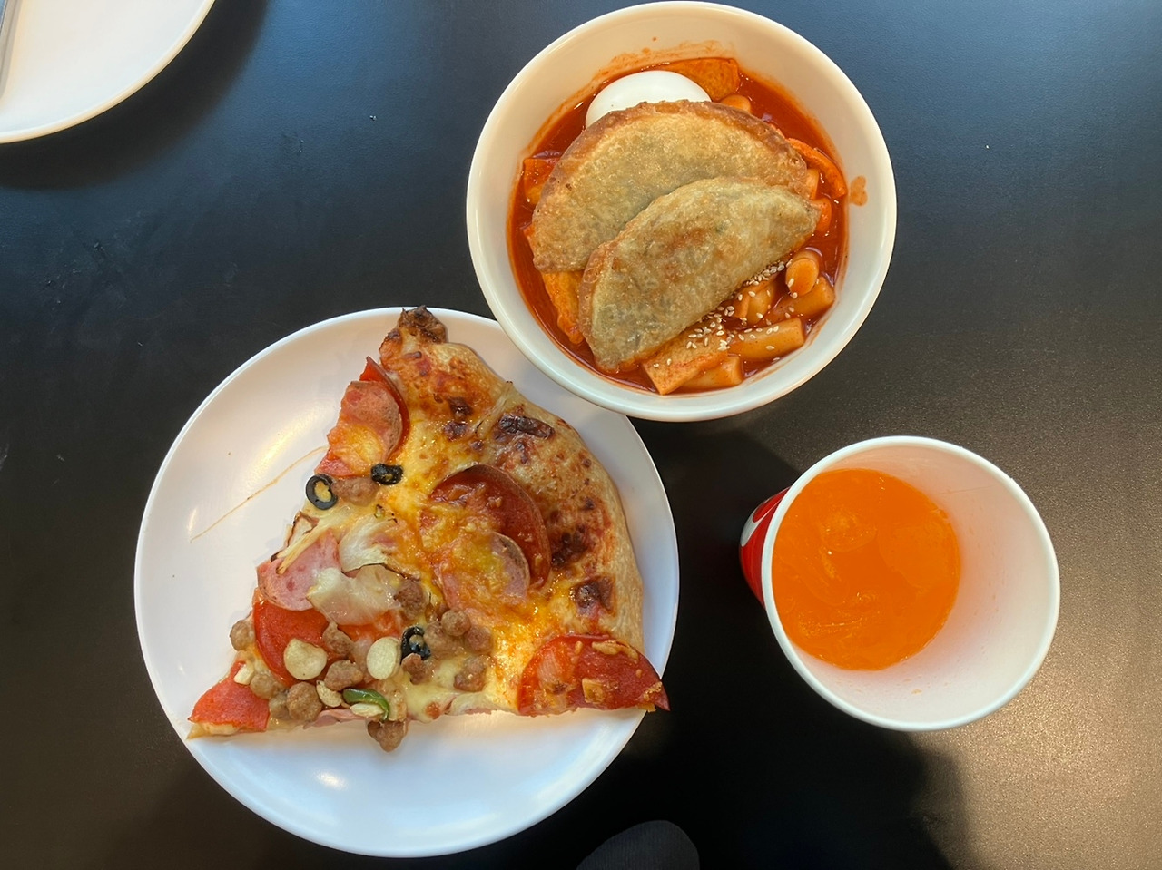 쇼핑을 하고 나오니 배가 고파져서 이마트 쪽에 있는 식당가로 갈까 하다 <트레이더스 카페>에서 간단하게 먹기로 했다. 이곳에서는 피자 한 조각에 3,000원부터이고, 무한 리필 음료 한 잔에 500원이니 가성비가 매우 좋았다. 우리는 콤비네이션피자(3,200원), 떡볶이(3,500원), 탄산음료(500원)를 주문했다. 키오스크에서 주문을 하자마자 음식이 금방 준비되어 바로 먹을 수 있었다.