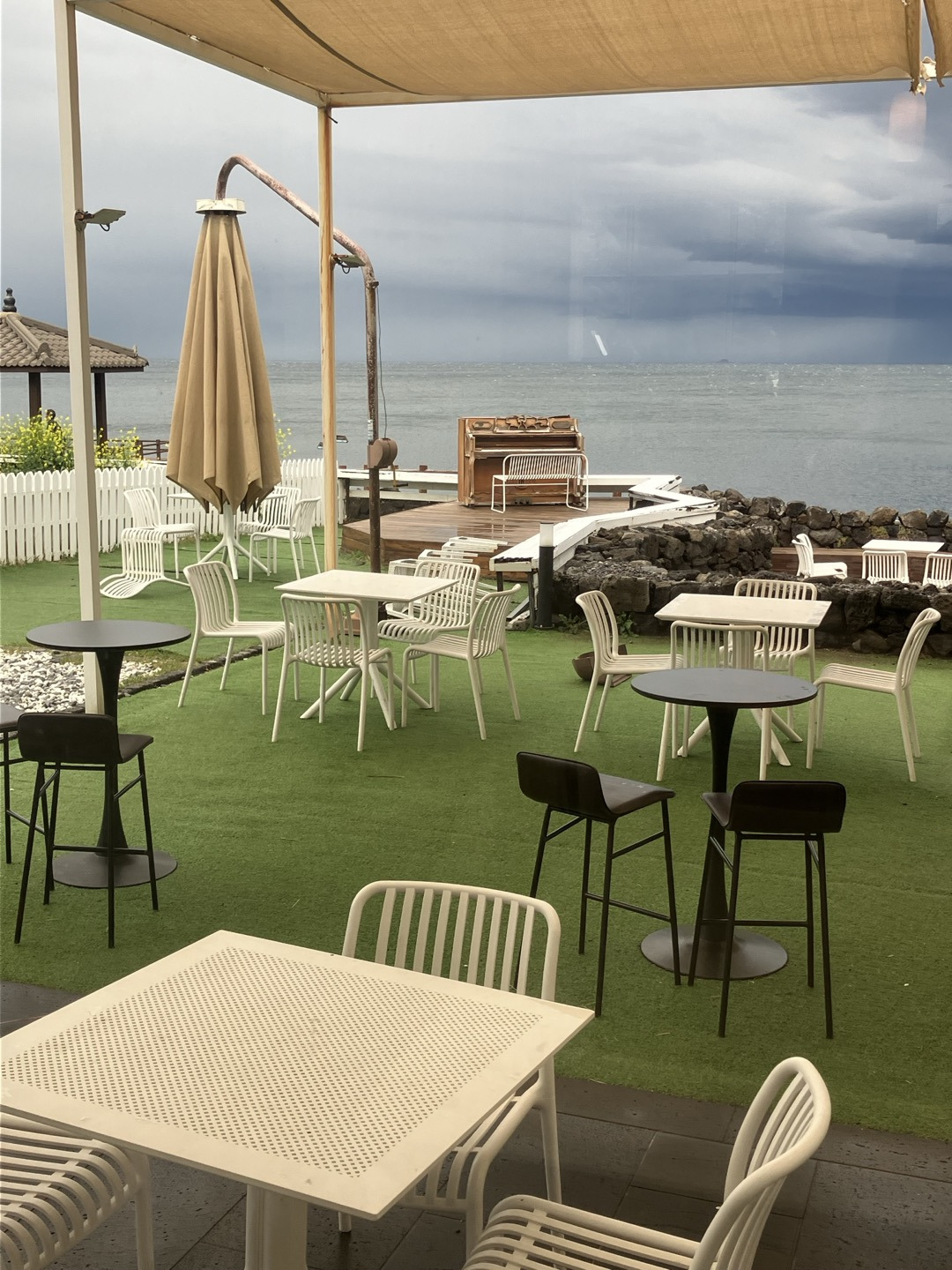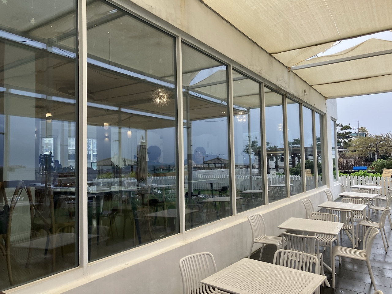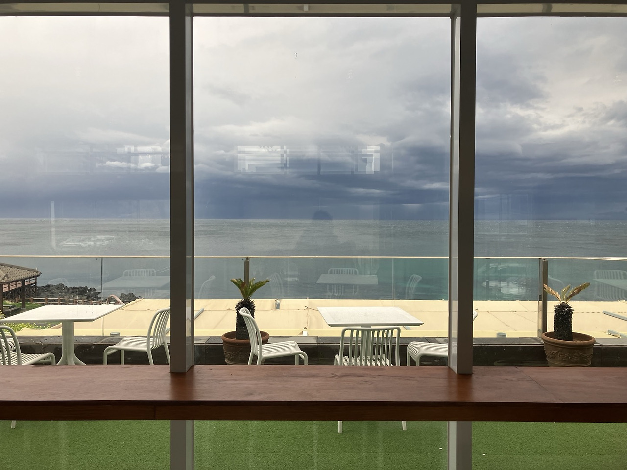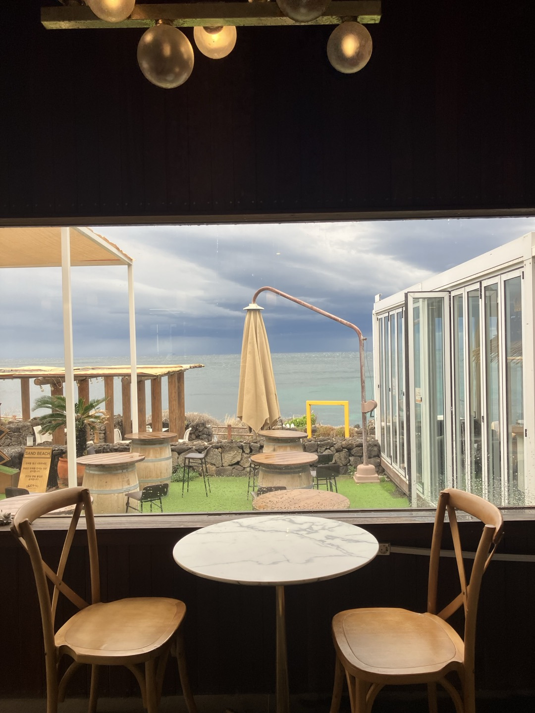 아메리카노(6,000원)와 디저트로 먹을 빵(4,000원)을 주문했는데, 원두는 산미가 있는 것과 없는 것 중에 고를 수 있었다. 다들 비를 피해 카페로 들어온 모양인지 사람이 몰려서 카페 안은 정신이 없었다. 2층 좌석에서는 1층보다 바다가 잘 보였지만 단체 손님들이 몰려 있어서 너무 시끄러웠다. 결국 1층 창가에 자리를 잡고 시간을 보냈는데, 비바람을 피해 바다를 볼 수 있어 다행이었다.(카페에서 시간을 보내는 동안 날씨는 더 나빠졌지만.) 커피 가격은 비싼 편이고, 빵의 맛도 평범했으나 그래도 바다를 보며 시간을 보낼 수 있어 좋았다.