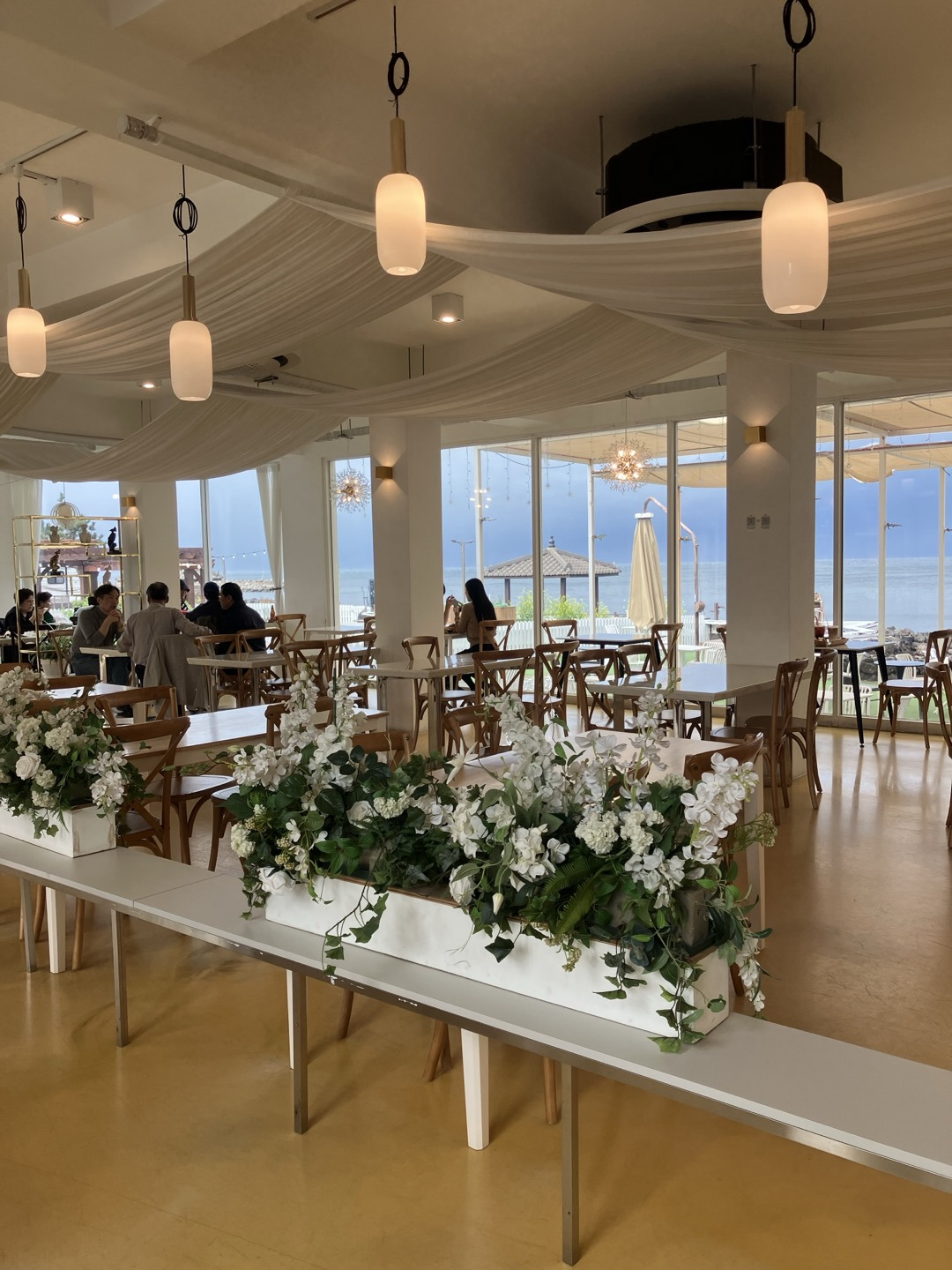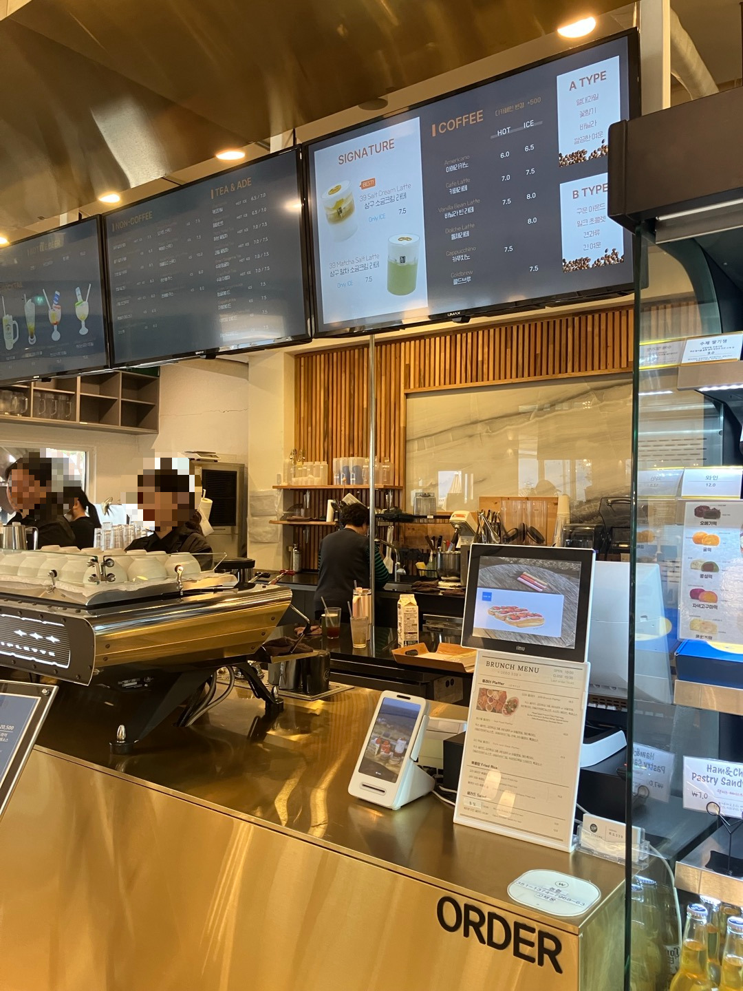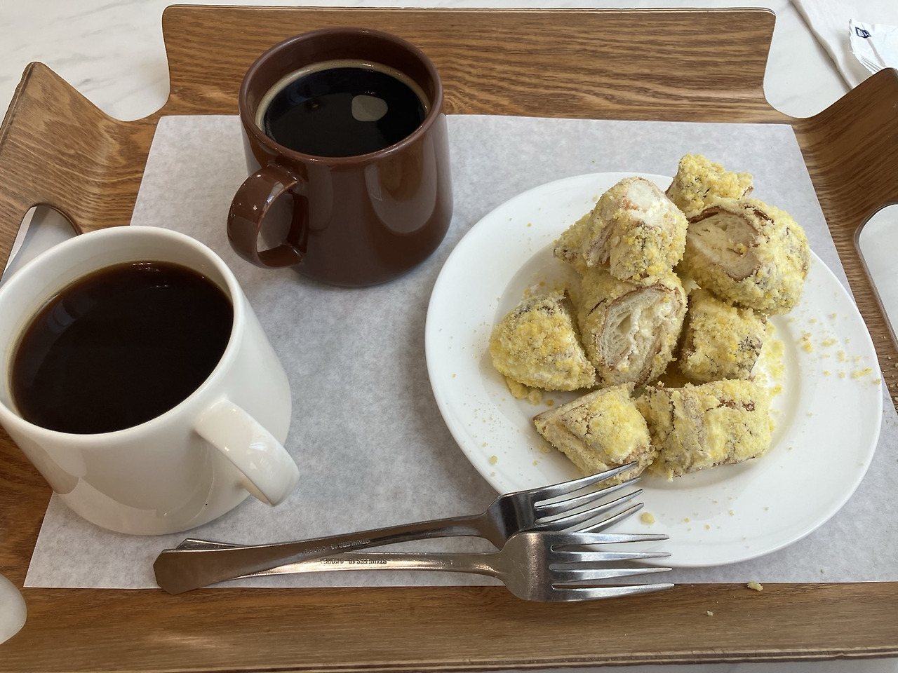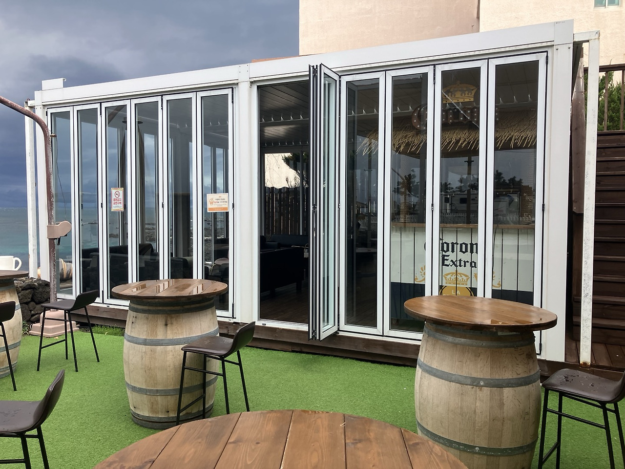 아메리카노(6,000원)와 디저트로 먹을 빵(4,000원)을 주문했는데, 원두는 산미가 있는 것과 없는 것 중에 고를 수 있었다. 다들 비를 피해 카페로 들어온 모양인지 사람이 몰려서 카페 안은 정신이 없었다. 2층 좌석에서는 1층보다 바다가 잘 보였지만 단체 손님들이 몰려 있어서 너무 시끄러웠다. 결국 1층 창가에 자리를 잡고 시간을 보냈는데, 비바람을 피해 바다를 볼 수 있어 다행이었다.(카페에서 시간을 보내는 동안 날씨는 더 나빠졌지만.) 커피 가격은 비싼 편이고, 빵의 맛도 평범했으나 그래도 바다를 보며 시간을 보낼 수 있어 좋았다.