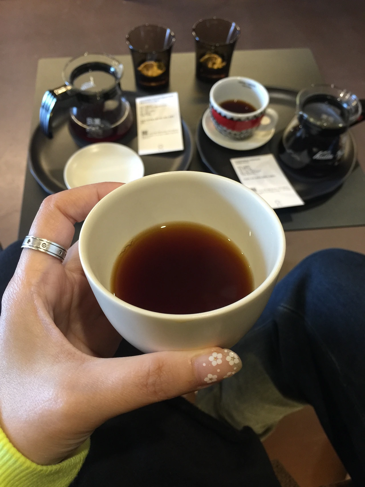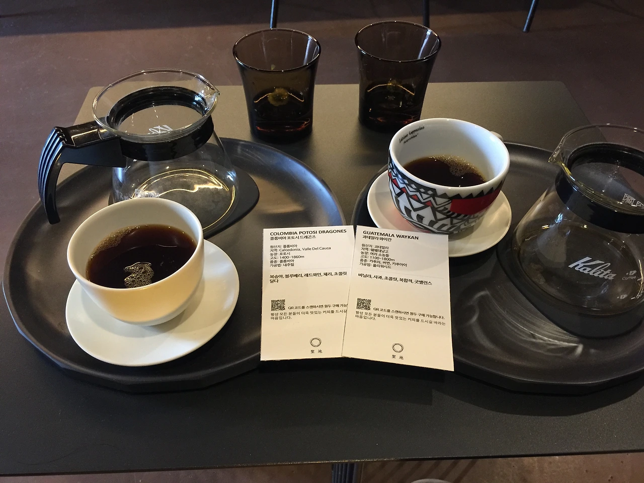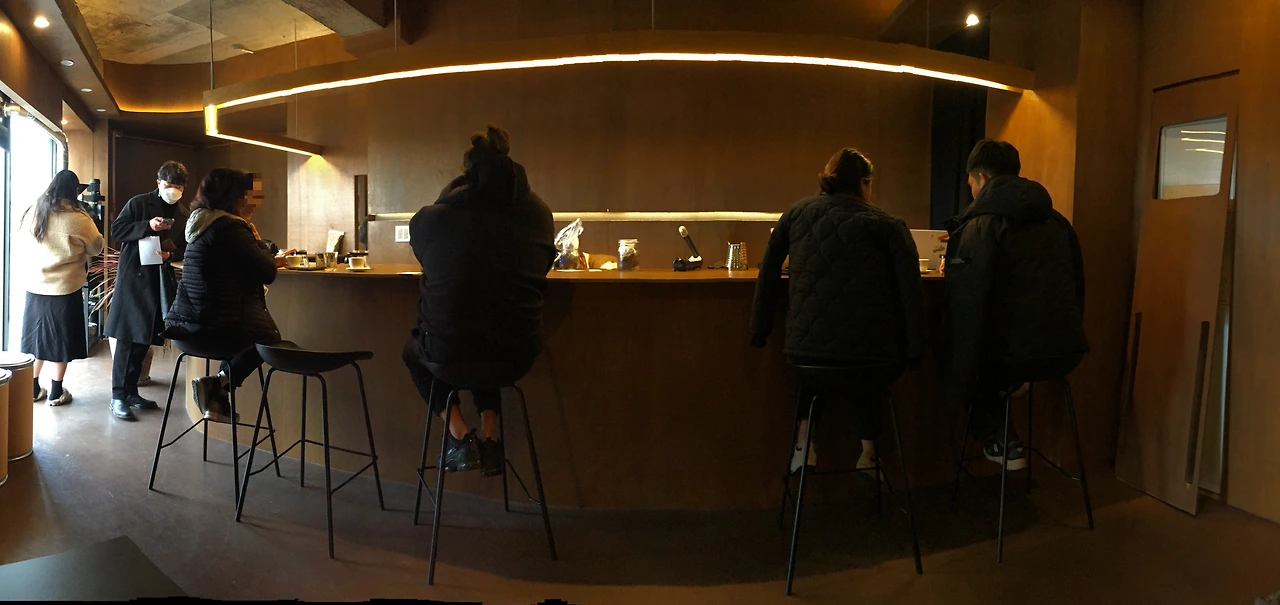 원두를 골라 주문을 하고 커피를 기다리는데, 핸드드립으로 커피를 내려야 하기 때문에 시간이 조금 걸렸다. 그사이 웰컴티로 나온 차를 마시며 카페 안을 둘러보았다. 카페는 전체적으로 우드톤으로 차분한 분위기여서 안정적인 느낌을 주었다. 조금 기다려 주문한 커피가 나오고 드립을 한 바리스타가 직접 서빙을 하며, 커피에 대해 설명을 해주어서 좋았다. 우리가 주문한 원두는 콜롬비아 원두와 과테말라 원두였는데, 밸런스가 좋아 커피맛은 나무랄 데가 없었다.