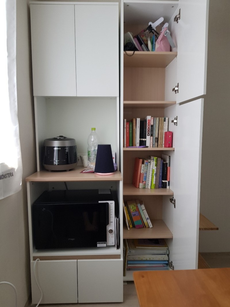 만족도가 매우 높은 필웰 광파오븐 수납장과 책장. 둘 다 10만 원대. 깔끔하게 정리할 수 있고, 책장도 닫을 수 있어서 내용물이 보이지 않아 넘나 깔끔해 보임. 견고하고 많은 것을 수납할 수 있다. ^^ 좁은 방의 히어로!!!