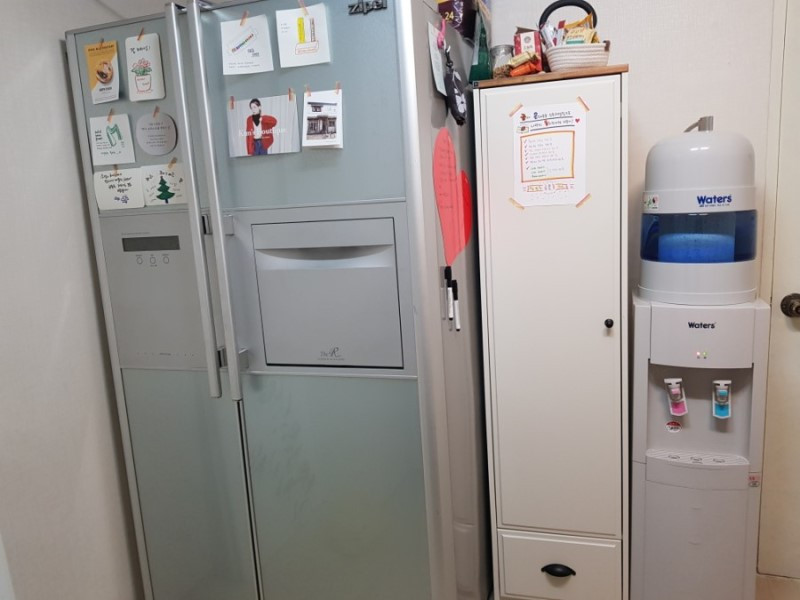 작은 방에는 큰 식탁, 오븐 수납장, 책장, 냉장고, 청소함, 정수기가 있다.