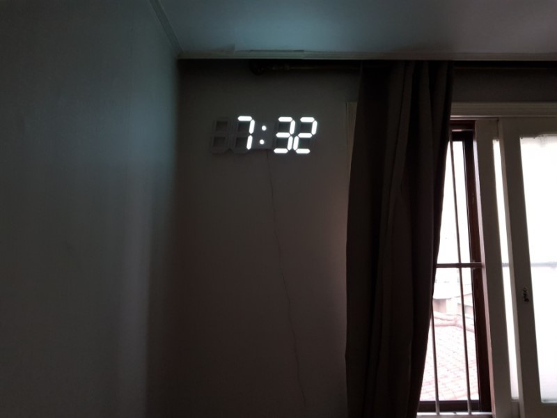 분위기 있는 LED 시계. 시간, 날짜, 온도, 습도까지 나오고, 자동 on, off 기능이 있어서 좋다. 보통 저녁 11시에 꺼지고 6시 30분에 켜지도록 설정해 놓았다. 소리도 안 나고 분위기 있어서 좋다. (브랜드는 까먹었다. ㅠㅠ)