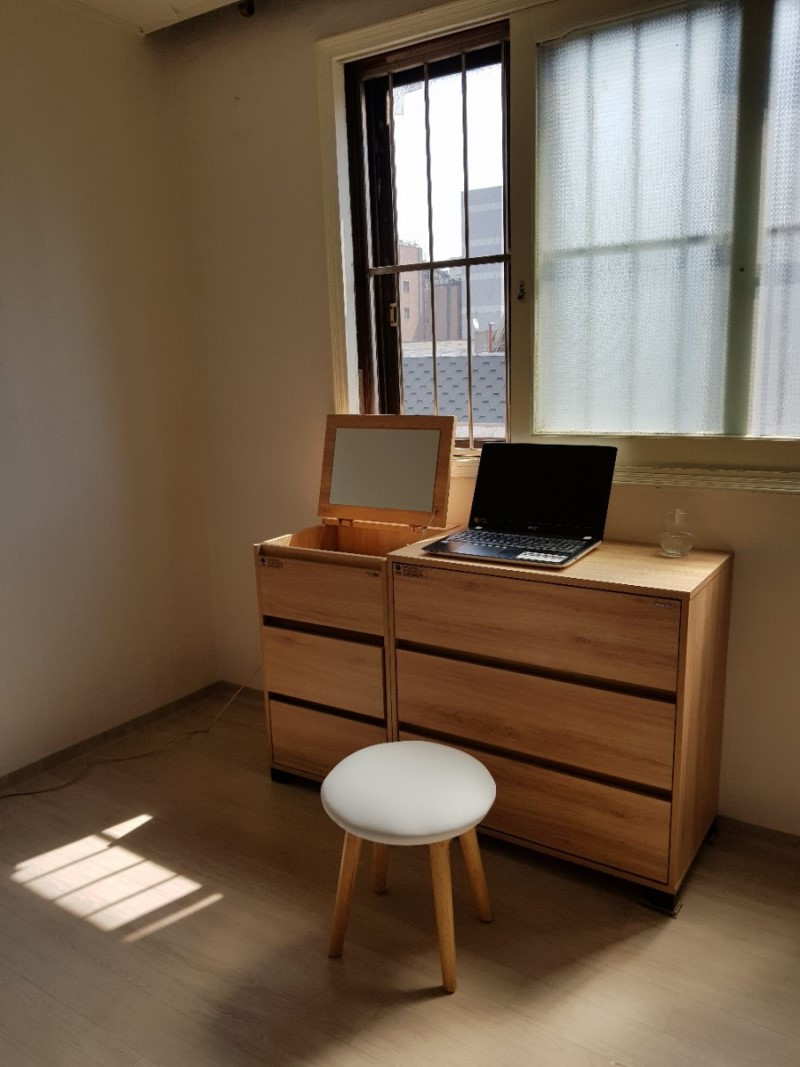 데코라인 브랜드는 좁은 공간에 효율적으로 배치할 수 있는 가구들이 많다. 맨 처음 수납 화장대를 발견하고 그 후에 양 옆에 놓을 서랍은 길이를 맞춰서 함께 구매했다. 통일성도 있고 깔끔해 보여 맘에 들었다. 무엇보다 화장대 겸 수납장으로 사용할 수 있어서 므흣. 로안 5단 서랍장은 옷도 꽤 많이 들어가서 뿌듯하다. 3단 서랍장은 나에겐 좀 작아서 신랑 속옷과 여름옷들을 넣어 두었다.