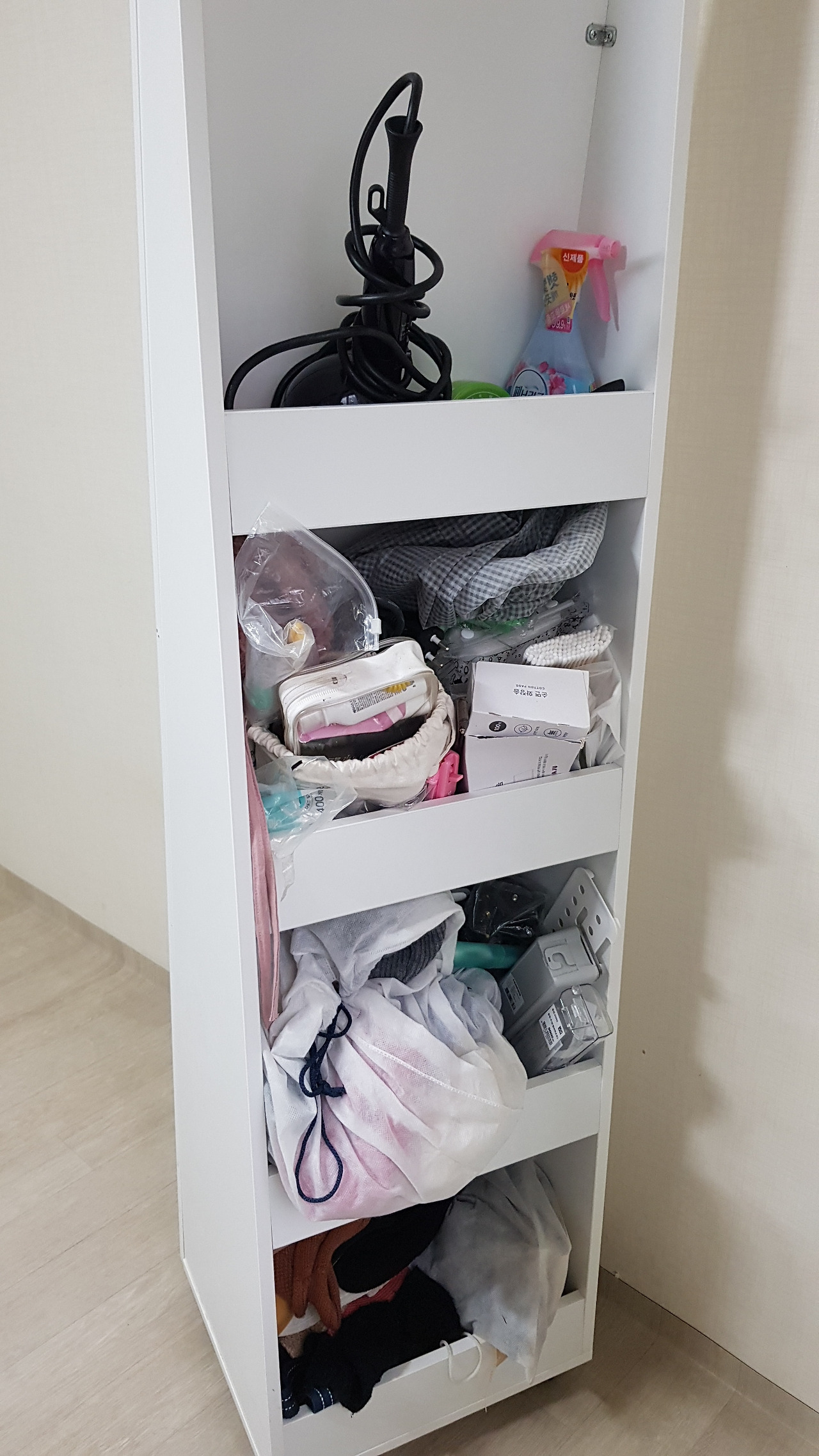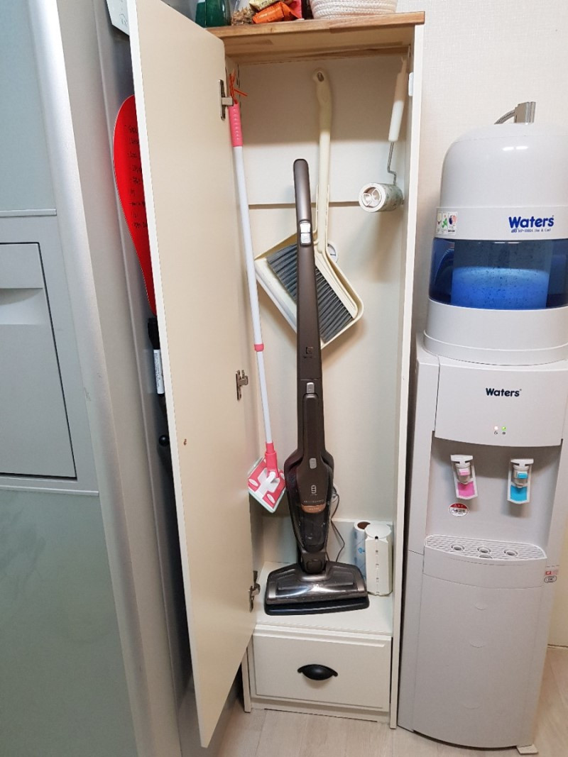 또 하나 잘 샀다고 자부하는 것이 리센트 청소기 수납장이다 ㅋㅋ 좁은 방 수납장은 무조건 잘 정리되고 잘 가려지는 걸로~~~ 청소도구들을 이 청소기 수납장에 넣고 문을 닫으면 완전 깔끔해 보인다. 굿굿.