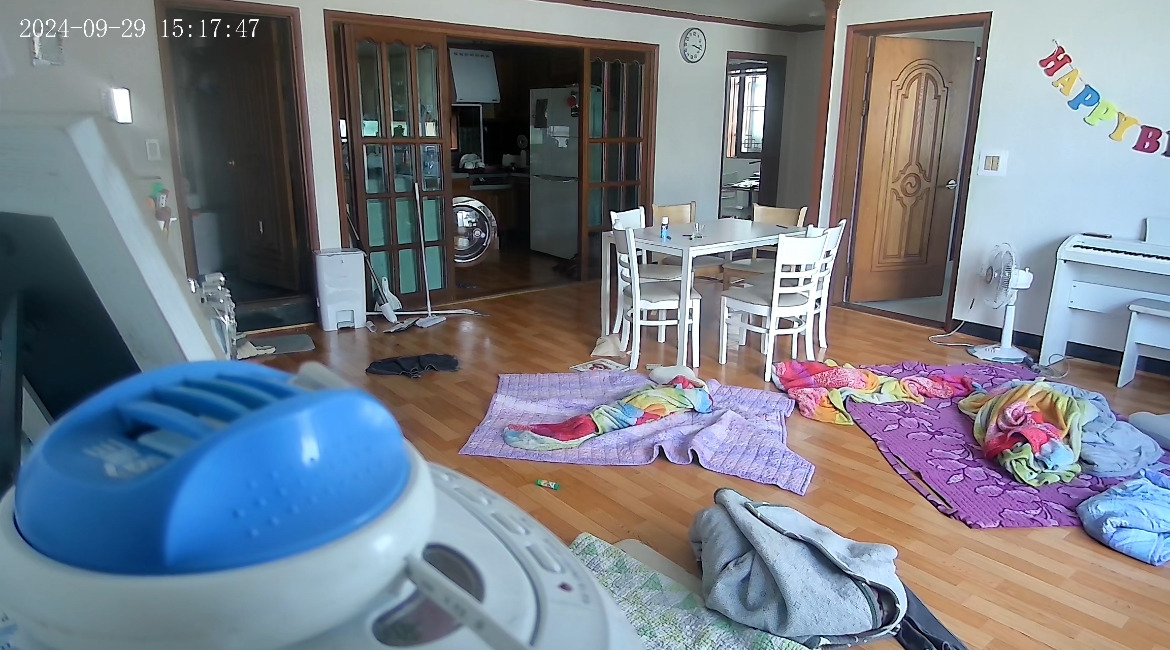 아이들이 거실에서 자서 거실 바닥 한가득 이불이 깔려있었다.