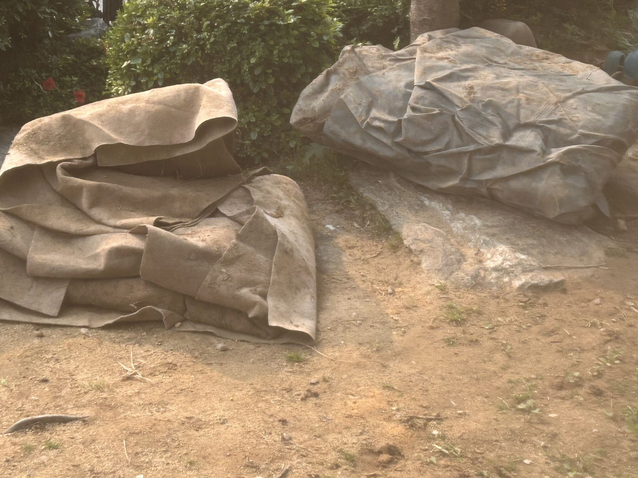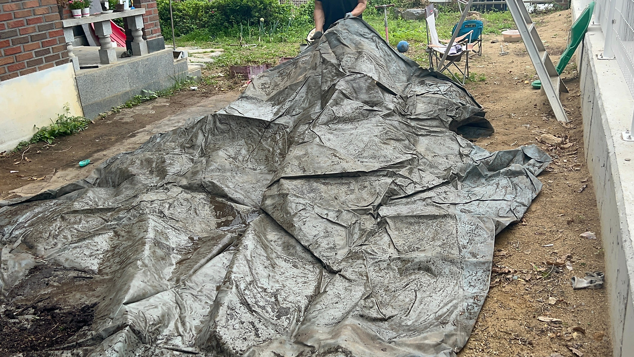 이사 오기 전에 사시던 분들이 마당에 깔아 두고 가신 천막 같은 것이 있었다.