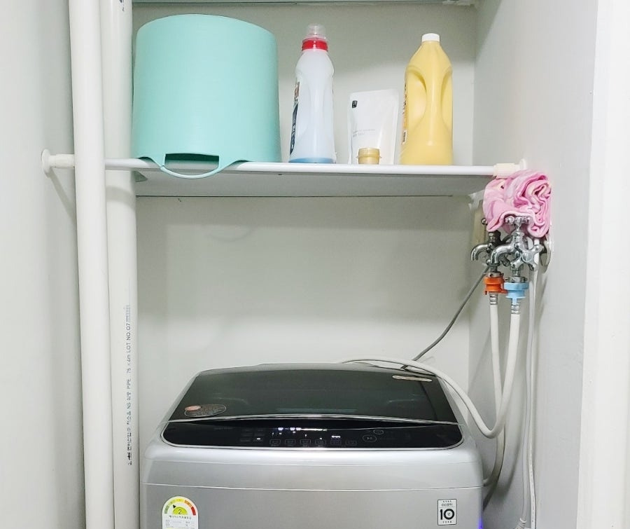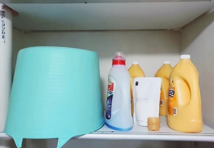 인터넷으로 구입한 섬유유연제가 도착했습니다. 여러분이라면 어디에 보관을 하실 건가요? 맞습니다. 세탁을 위한 생활용품이니 당연히 그 쓰임이 가까운 곳에 놓는 게 맞겠죠? 그래서 전 세탁기 위 선반에 자리를 내주었습니다.
