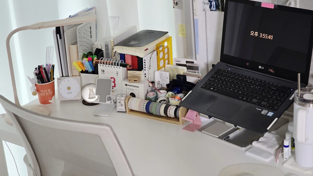 제 책상 위에는 여러 가지의 다이어리와 문구들이 놓여 있습니다. 나이가 들다 보니 넣고 꺼내기가 참 귀찮더라고요. 물론 이 물건들을 넣어놓을 수납장이 없다는 것도 이유이고요. 그러나 여기 있는 진짜 이유는 제가 자리를 정해주었기 때문입니다. 전혀 미니멀라이프를 사는 사람의 책상 같지가 않다고요?