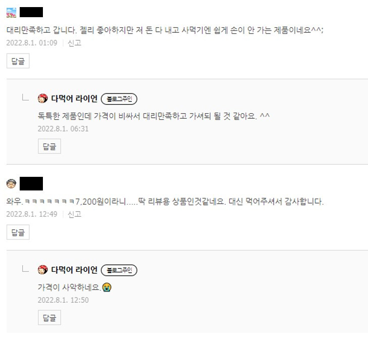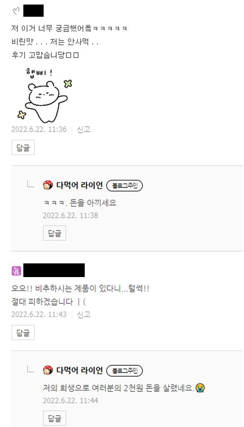 물가가 오르고 맛이 궁금하지만 선뜻 돈주고 먹자니 고민되는 상황에서 누군가 나를 대신해 구매해서 리뷰를 해준다는 건 매력포인트다. 어떤 블로거가 돈을 쓰고 맛없는 제품은 돈아까우니 구매하지 말라고 조언까지 준다. 그 글을 읽는 사람은 돈을 아끼고 맛없는 음식먹는 스트레스도 줄였으니 해당 블로거가 고마울 수 밖에 없다. 고마움을 표현하는 건 시간이 오래 걸리지 않는다. 그래서, 내 블로그의 댓글 중에는 이런 댓글들이 많다.