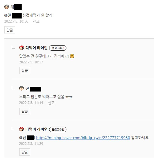 블로그는 플랫폼 특성상 댓글 태그 달리는 경우를 보기 힘들다. 친구 태그 이벤트 진행을 제외하고 태그 달리는 경우가 적은데 (SNS와 다르게) 블로그 댓글에 태그다는 경우를 보게 된다. 맛있는 음식을 친구에 권유하기 위해 친구 태그를 거는 블로그이웃들의 경우 20대 초반의 회원들이 많은 편이다.