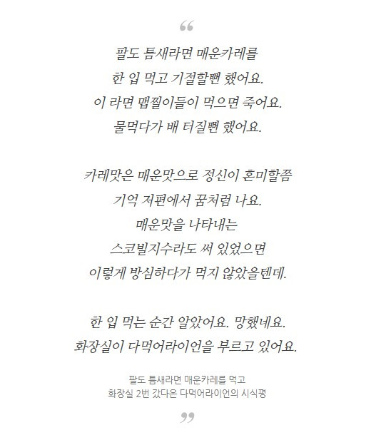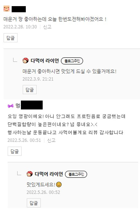 식품 리뷰를 보다가 웃는 경우는 많지 않은 것 같다. 정보 전달이 주목적이기 때문에 웃을일이 없는데 이런 댓글들이 달리는 포스팅이 있다. 매운 제품을 먹고나서 소감을 쓰는 경우 이러한 반응들이 댓글로 달린다. 리뷰에서 어떤 대목을 올렸길래 이런 반응이 있는지 원문을 캡쳐해서 소개한다.