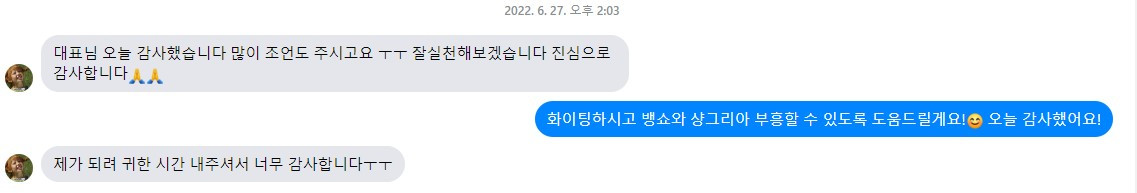 "올려주신 덕분에 큰 도움이 되고 있어요. 제품을 보내드릴때마다 정성스럽게 작성해주시니 항상 고맙습니다. 형님. 제가 도울일이 있으면 언제든지 편안하게 이야기주세요."