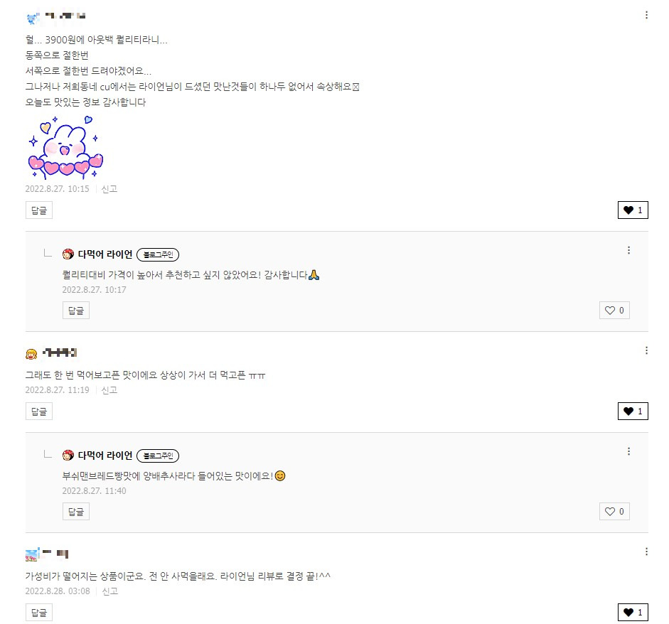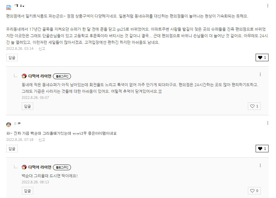 편의점음식 콘텐츠도 향수를 불러일으키는 댓글을 불러올수도 있다는 것을 콘텐츠를 기록하면서 경험하고 있다. 맛없는 것은 어떤 점때문에 맛없다고 하고,맛있는 것은 왜 맛있는지 '나만의 기준과 취향'을 가지다보니 나로인해 돈을 절약했다는 댓글들이 글을 쓸때마다 달리곤 한다.