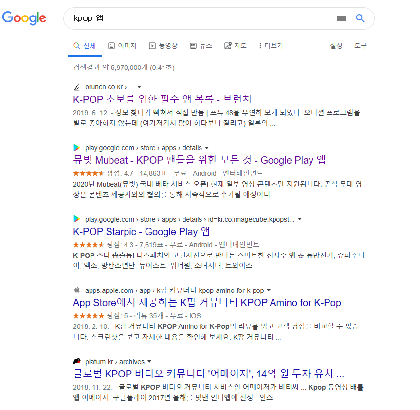 구글에 KPOP 앱/ KPOP 추천앱 검색시 첫줄에 노출되고 있더라