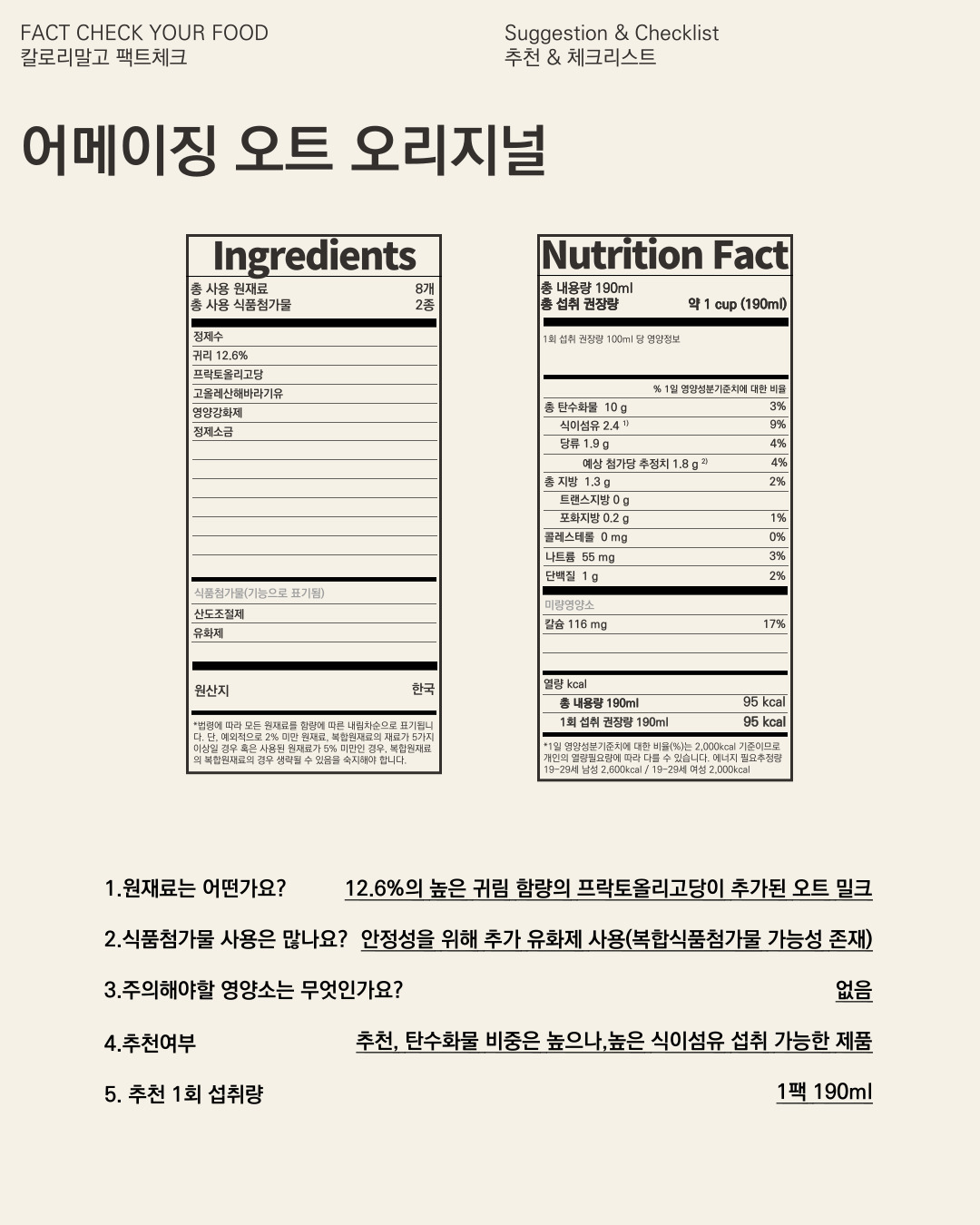 : 정제수, 귀리, 프락토올리고당, 고올레산해바라기유, 영양강화제, 정제소금, 산도조절제, 유화제