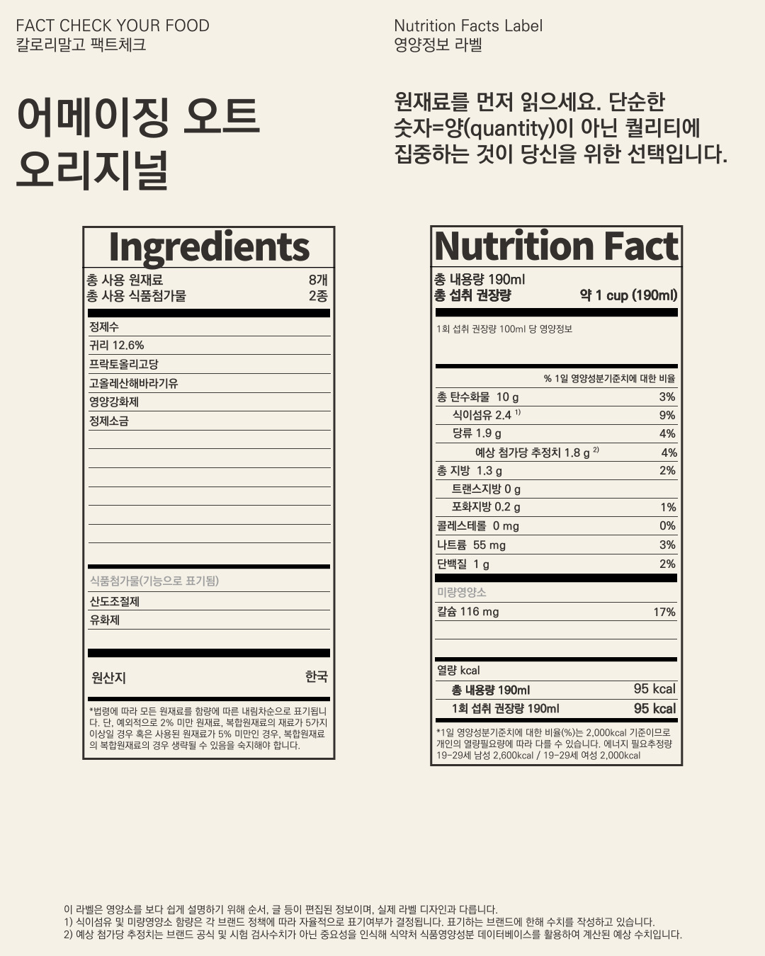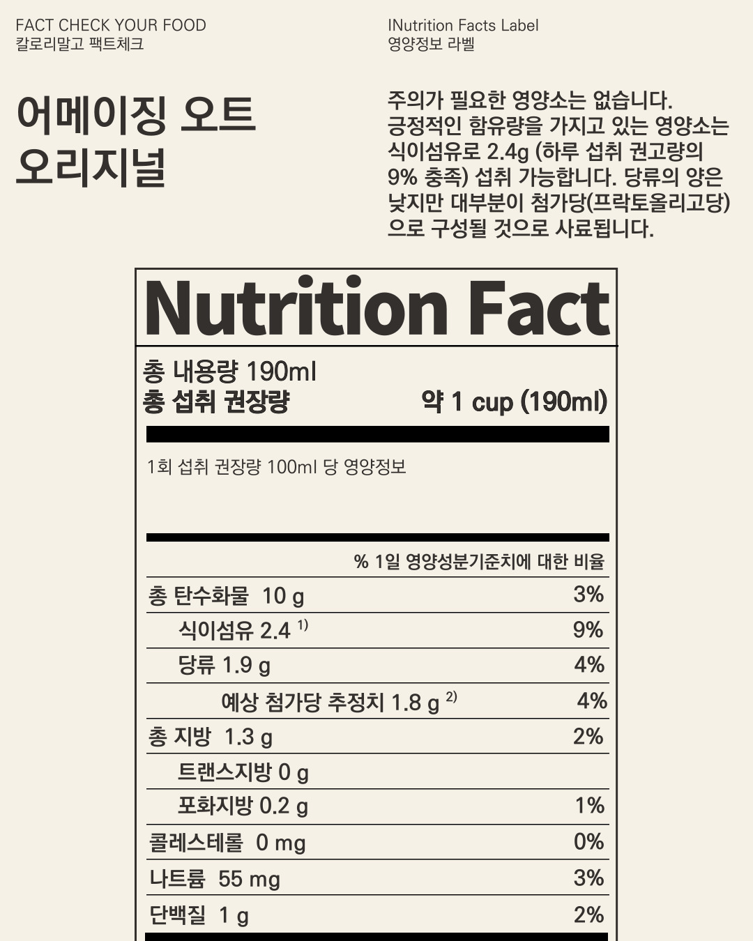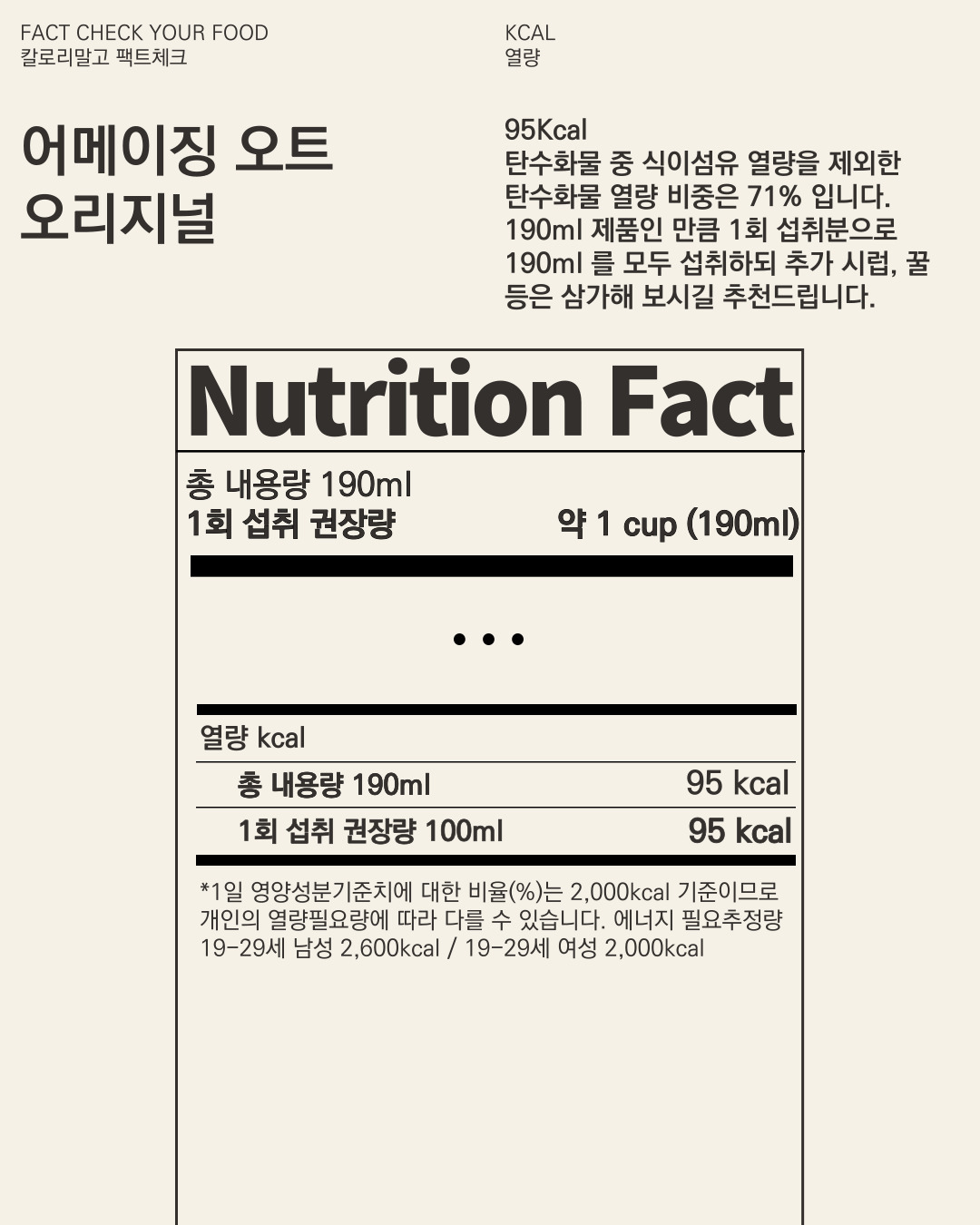 (다른 제품은 100ml 기준으로 살펴본 만큼 190ml 기준으로 명시되어 있는 영양정보를 100ml로 환산했습니다)