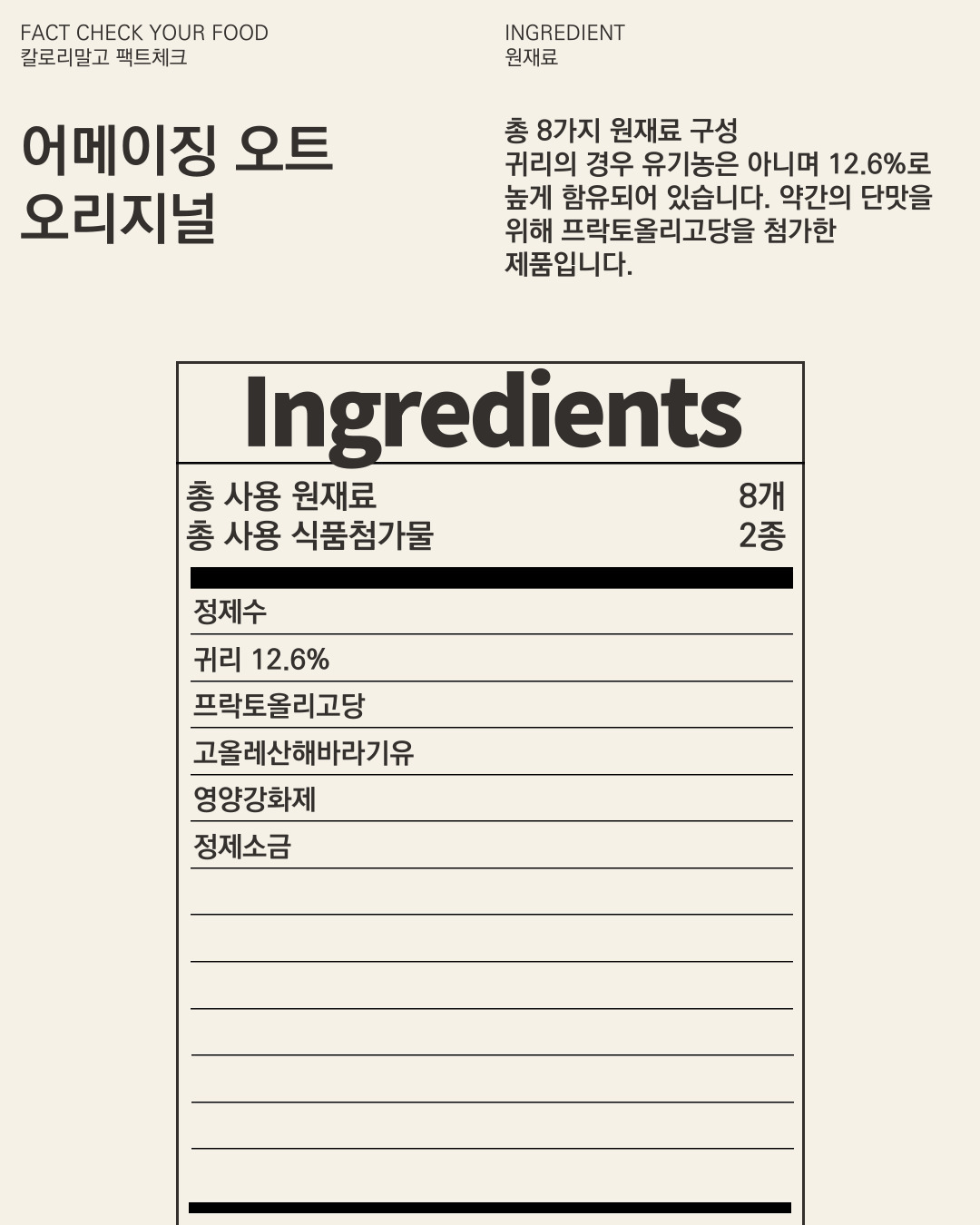 어메이징 오트 오리지널의 원재료는 총 8가지로 구성되어 있어요.