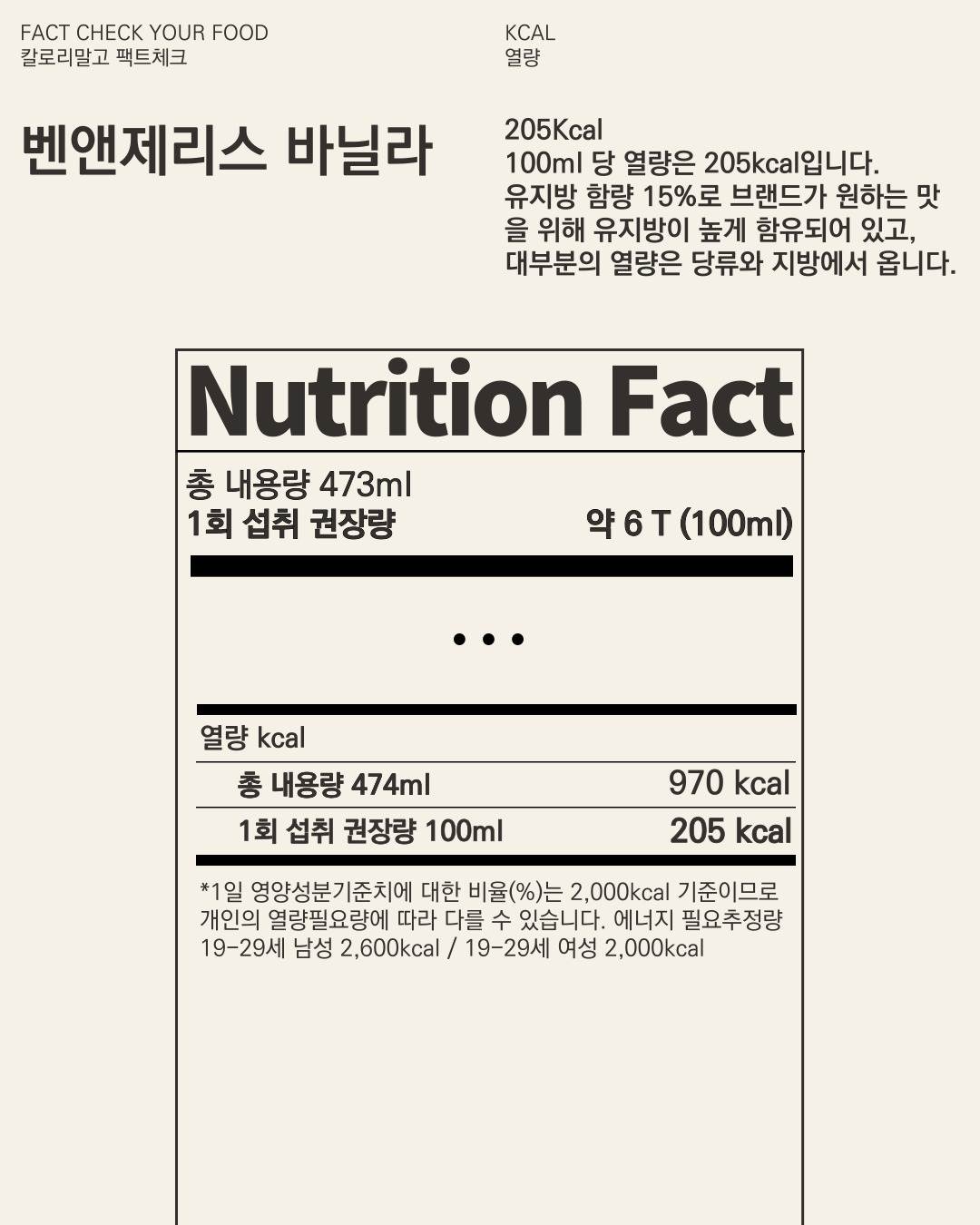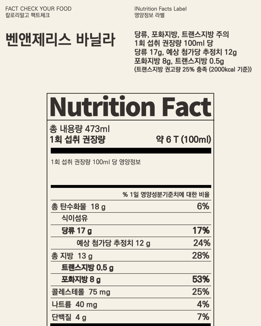 *이 수치는 원재료 작성 순서와 식품의약품안전처 식품영양성분 데이터베이스, 미국 출시 벤앤제리 제품의 영양정보표를 참고한 개인적인 예측이므로 실제 해당 제품의 정보와 상이할 수 있습니다.