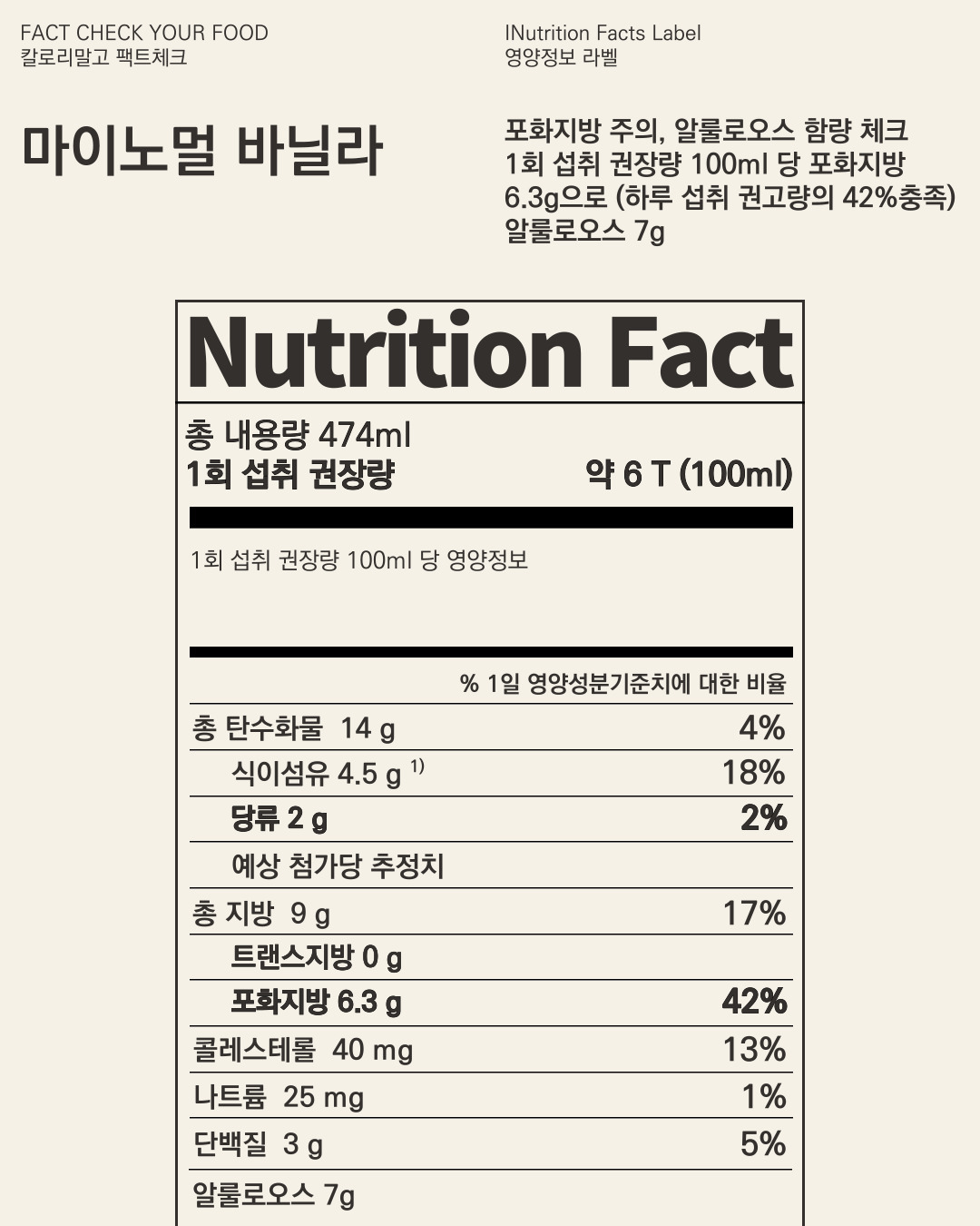 마이노멀 바닐라 아이스크림에서 주의해야 하는 영양소는 포화지방, 한번 더 체크해야 하는 영양소는 알룰로오스입니다.