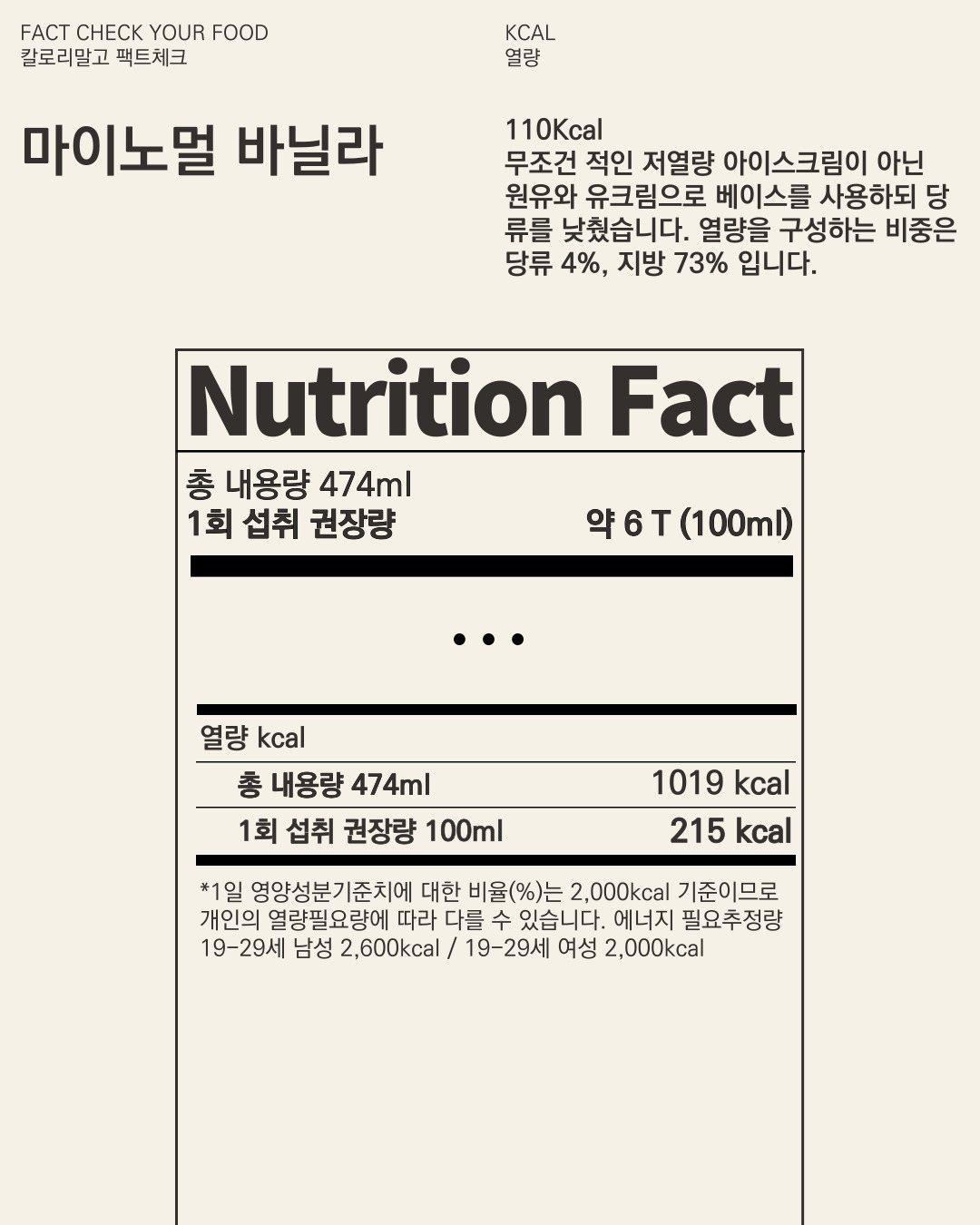 그러나 아이스크림은 아이스크림입니다. 열량적인 면에서는 평소 아이스크림 섭취보다 조금 더 여유분을 가지고 섭취할 수 있다고 생각할 수 있으나 포화지방의 섭취량에 유의하며 권장량 100ml을 지켜보셨으면 합니다.