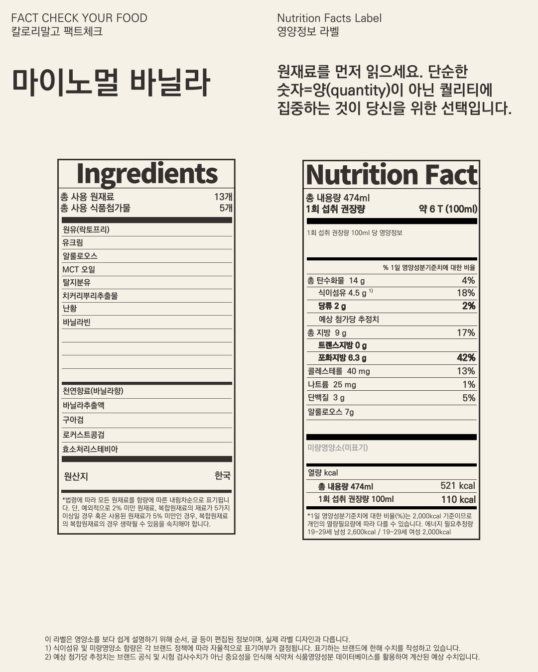 여러분은 어떠실지 모르겠습니다. 아이스크림 100ml 당 110kcal를 적다고 생각하실지 많다고 생각하실지를요. 저는 개인적으로 많다고 생각하지 않기에 다른 저칼로리 아이스크림과 비교한다면 첨가물 함량이 낮고 원재료의 사용이 가공을 최소화한 재료들이 첨가되어 추천합니다.