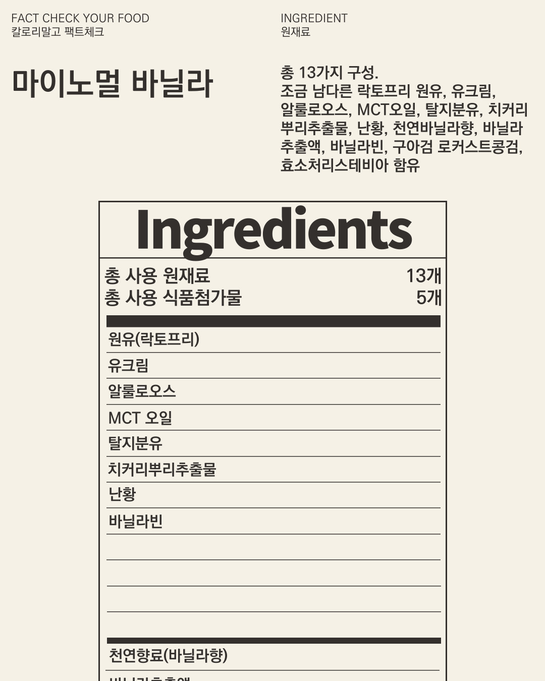 마이노멀 바닐라 아이스크림의 원재료는 원유(락토프리), 유크림, 알룰로오스, MCT오일, 탈지분유, 치커리뿌리추출물, 난황, 천연바닐라향, 바닐라추출액, 바닐라빈, 구아검 로커스트콩검, 효소처리스테비아 가 들어가 총 13가지로 구성되어 있어요.