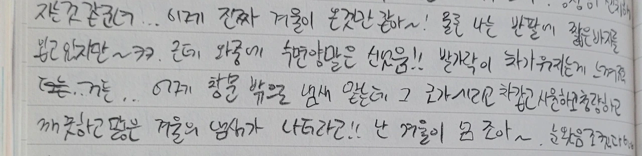 이제 진짜 겨울이 온것만 같아~! 물론 나는 반팔에 짧은바지를 입고 있지만~ㅋㅋ. 근데 와중에 수면양말은 신었움!! 발가락이 차가워지는게 느껴졌거든.. 어제 창문 밖으로 냄새 맡는데 그 코가시리고차갑고시원하고청량하고깨끗하고맗은 겨울의 냄새가 나더라고!! 난 겨울이 넘 조아~. 눈왔음조켔다♡U♡