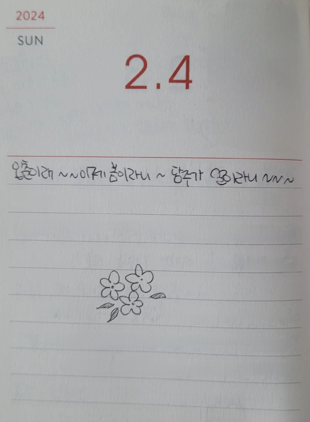 저 일기를 적은 때인 일 년 전, 정확히는 일 년 하고도 반년 정도의 과거는 꽤 가깝게 느껴진다. 아마 대부분은 한 해를 가득 채운 과거의 일기장 중 가장 가까운 날의 추억이기 때문일 것이다. 책 한 권을 만들겠다는 다짐으로 구매한 일기장. 그 크기는 작았지만 꽤 많은 내용을 담을 수 있었고, 막상 대부분은 채우지도 못했다. 힘들었던 시기에는 몇 달을 비워둔 흔적도 남아있는 그런 일기장이다. 그럼에도 명절은 꽤 큰 이벤트였고, 입춘이라는 날과 겹쳐 꽃 몇 송이와 함께 그려 넣을 수 있었다.