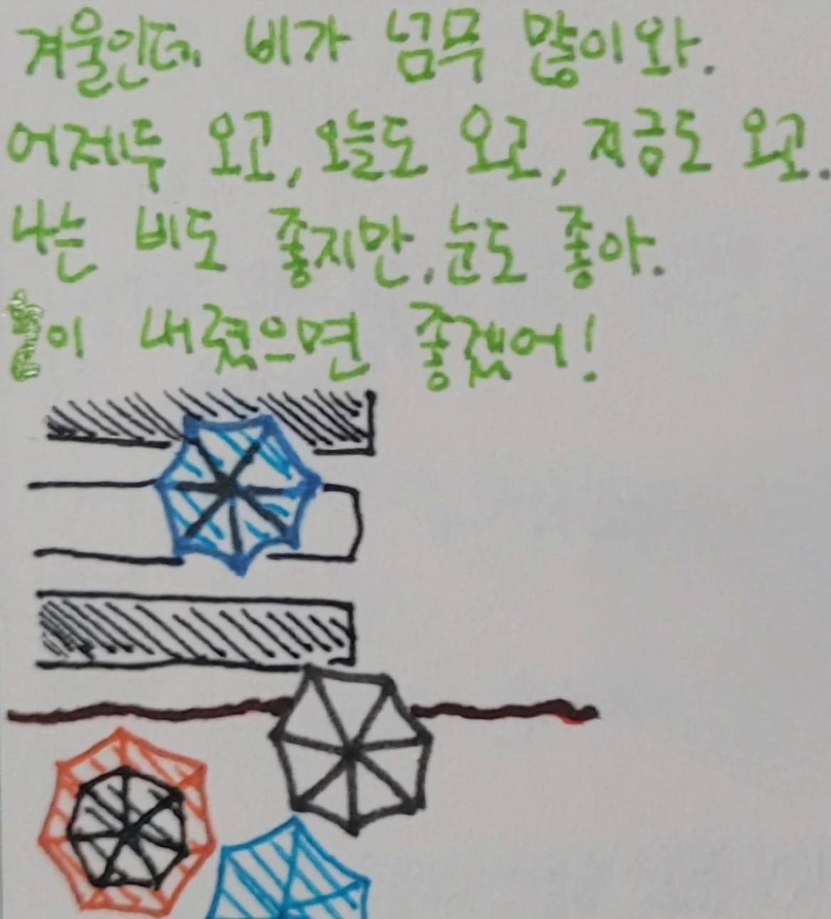 겨울인데 비가 넘무 많이와.